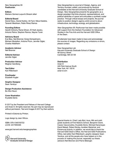 © 2017 by the President and Fellows of Harvard College and Actar D. All rights reserved. No part may be reproduced without permission. Text and Images © 2017 by their authors. Printed in Estonia by Printon. Logo design by Jean Wilcox. ISBN: 978-1-945150722 LCCN: 2017955395 www.gsd.harvard.edu/newgeographies