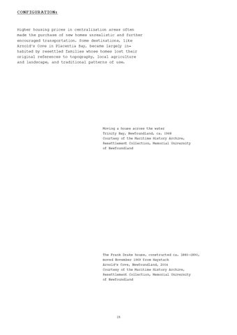 Configuration: Higher housing prices in centralization areas often made the purchase of new homes unrealistic and further encouraged transportation. Some destinations, like Arnold’s Cove in Placentia Bay, became largely inhabited by resettled families whose homes lost their original references to topography, local agriculture and landscape, and traditional patterns of use.