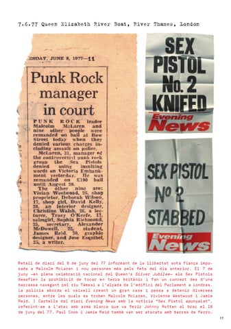 Retall de diari del 8 de juny del 77 informant de la llibertat sota fiança imposada a Malcolm McLaren i nou persones més pels fets del dia anterior. El 7 de juny —en plena celebració nacional del Queen’s Silver Jubilee— els Sex Pistols desafien la prohibició de tocar en terra britànic i fan un concert des d’una barcassa navegant pel riu Tàmesi a l’alçada de l’edifici del Parlament a Londres. La policia aborda el vaixell creant un gran caos i passa a detenir diverses persones, entre les quals es troben Malcolm McLaren, Vivienne Westwood i Jamie Reid. | Cartells del diari Evening News amb la notícia “Sex Pistol apunyalat”, referint-se a l’atac amb arma blanca que va ferir Johnny Rotten al braç el 18 de juny del 77. Paul Cook i Jamie Reid també van ser atacats amb barres de ferro. 67