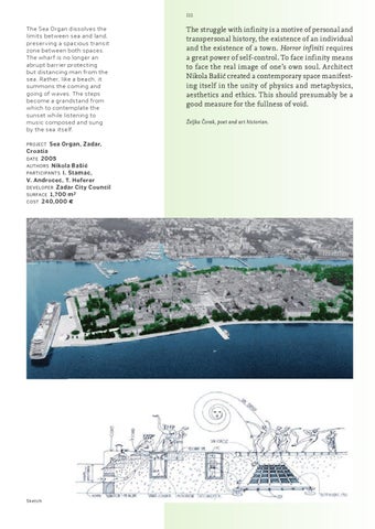 The Sea Organ dissolves the limits between sea and land, preserving a spacious transit zone between both spaces. The wharf is no longer an abrupt barrier protecting but distancing man from the sea. Rather, like a beach, it summons the coming and going of waves. The steps become a grandstand from which to contemplate the sunset while listening to music composed and sung by the sea itself. Project Sea Organ, Zadar, Croatia date 2005 Authors Nikola Bašić participants I. Stamac, V. Androcec, T. Heferer developer Zadar City Council Surface 1,700 m 2 Cost 240,000 m