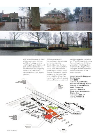 rather than a new container. As if furnishing an uninviting home, the pieces of the new project are fitted together in an eclectic, fragmentary amalgam that balances the unitary character of the porticoed slab. Project A8ernA, Zaanstad, Netherlands date 2005 authors NL Architects, Pieter Bannenberg, Walter van Dijk, Kamiel Klaasse, Mark Linnemann Developer Zaanstad Programme Management Dienst Stad Surface 24,000 m 2 cost 2,700,000 m