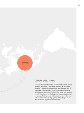 GLOBAL SAND TRADE The market for mined sand has become a billion-dollar annual business, growing at 10 percent a year since 2008. This has spawned a massive global sand trade both legal and illicit. Its legal trade is estimated at $70 billion per year with a global annual sand consumption in excess of 15 billion tons. Because of rapid urbanization, sand is beginning to procure a condition of scarcity affecting coastal real estate expansion policies, land values, and even territorial geopolitics. China, Singapore, and the UAE are the largest importers of sand.