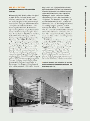 many in 1910. The city’s population increased in parallel from 86,000 to 425,000. Rotterdam’s economic urban center beckoned industrialists such as the Van der Leeuw family, which was importing, tea, coffee, and tobacco. Another similar company, but one that was organized as a cooperative, was the coffee, tea, and grain collective HandelsKammer, or HaKa, a wholesaler established in 1914 for the working class. Haka’s new building, designed by Herman Friedrich Mertens (1885–1960), was erected in 1931– 1932. The narrow site both fronted the water and rail networks, and inspired cantilevering of the six floors of the concrete frame building, which had circular and ribbon windows resembling a ship at the port’s docks. Van Nelle’s owners, Kees van der Leeuw and his brother Dick (1894–1936) were inspired by Theosophy, a mystical religious movement that gained popularity in the late nineteenth century. In 1923, Kees helped to build the Amsterdambased headquarters of the Order of the Star in the East, an offshoot of the Theosophical Society’s India branch. He was also extremely active as the Order’s secretary, and determined that the Van Nelle factory’s design, construction