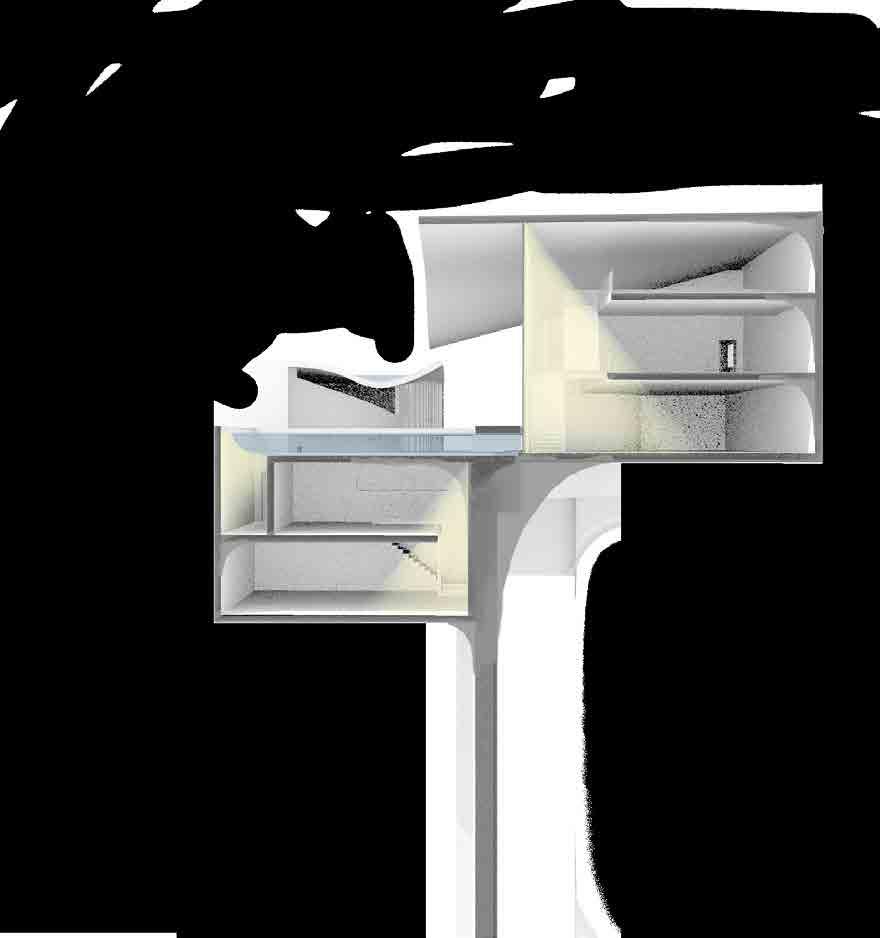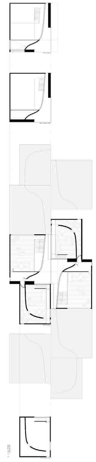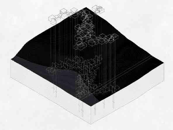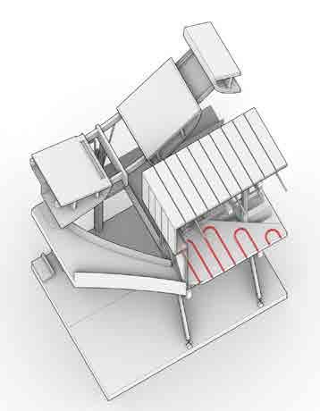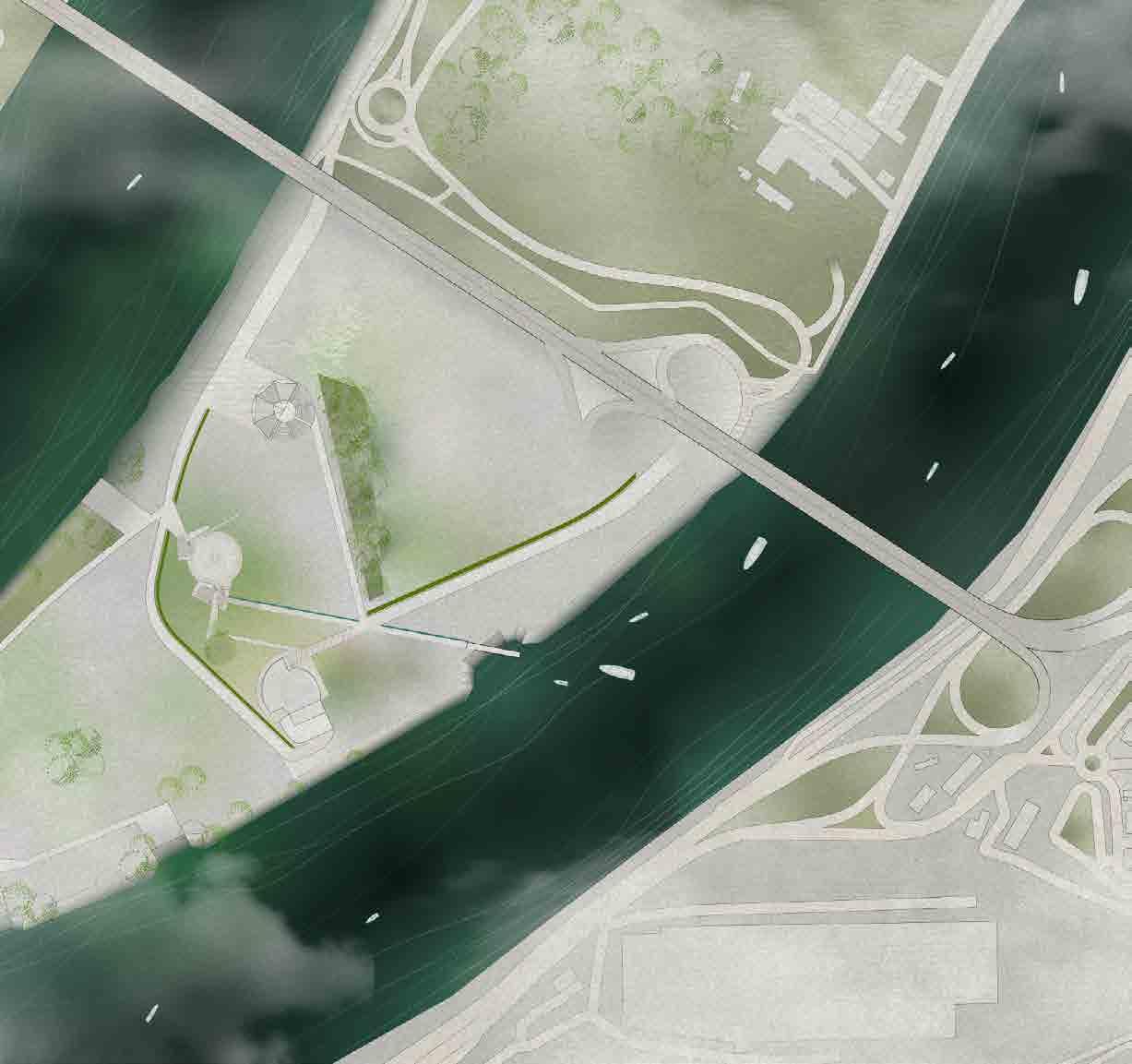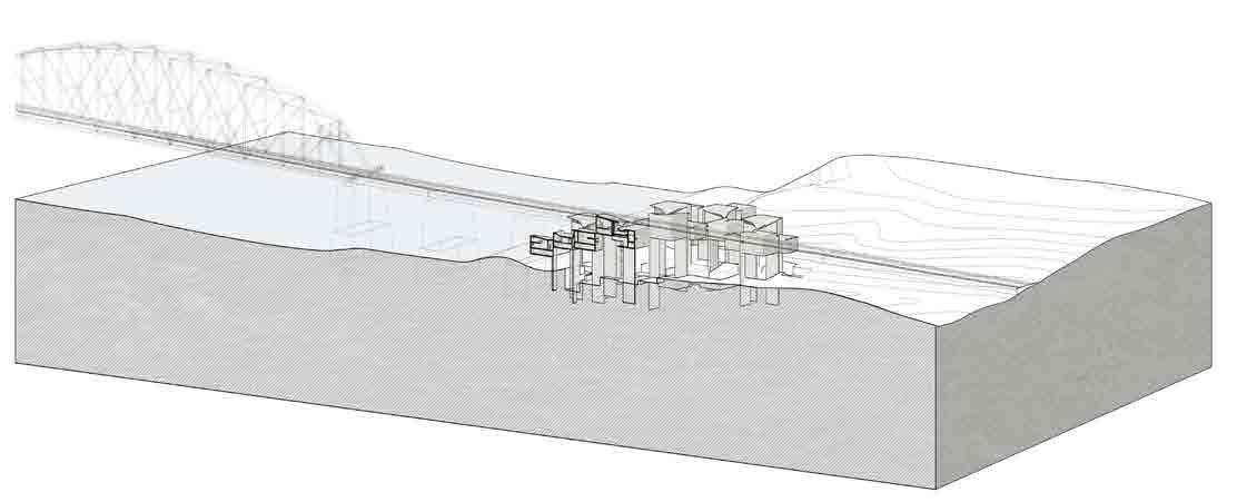 The structure is organized into a double helix, creating two courtyards, one public and one private. From the bridge, visitors are first given access to the rooftop terraces before being led into the public courtyard. The overlap of the two helixes are thickened and raised in order to give privacy to the private courtyard that opens up into the river. Here, the proximity to the water creates a floodable plane that accounts for swells in water level and brings water into the lives of the residents in the form of a larger body of water. The structure is held up by a system of walls that extend from within the units, helping to define the plan, to within the ground, helping to funnel the water and create a closed geothermal loop that powers the system. The water is funneled into a series of cavities that mirror the language of the system above.