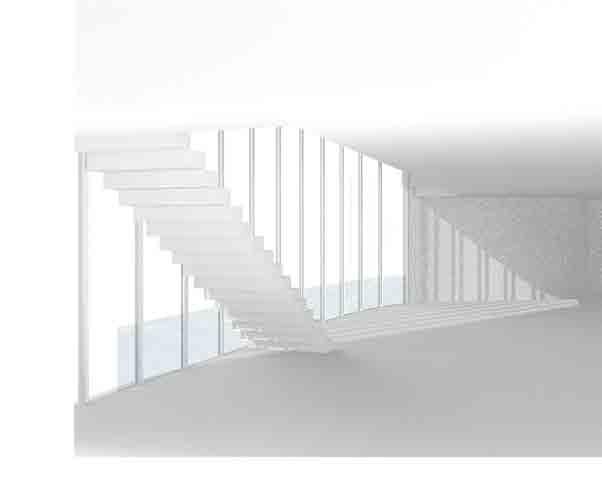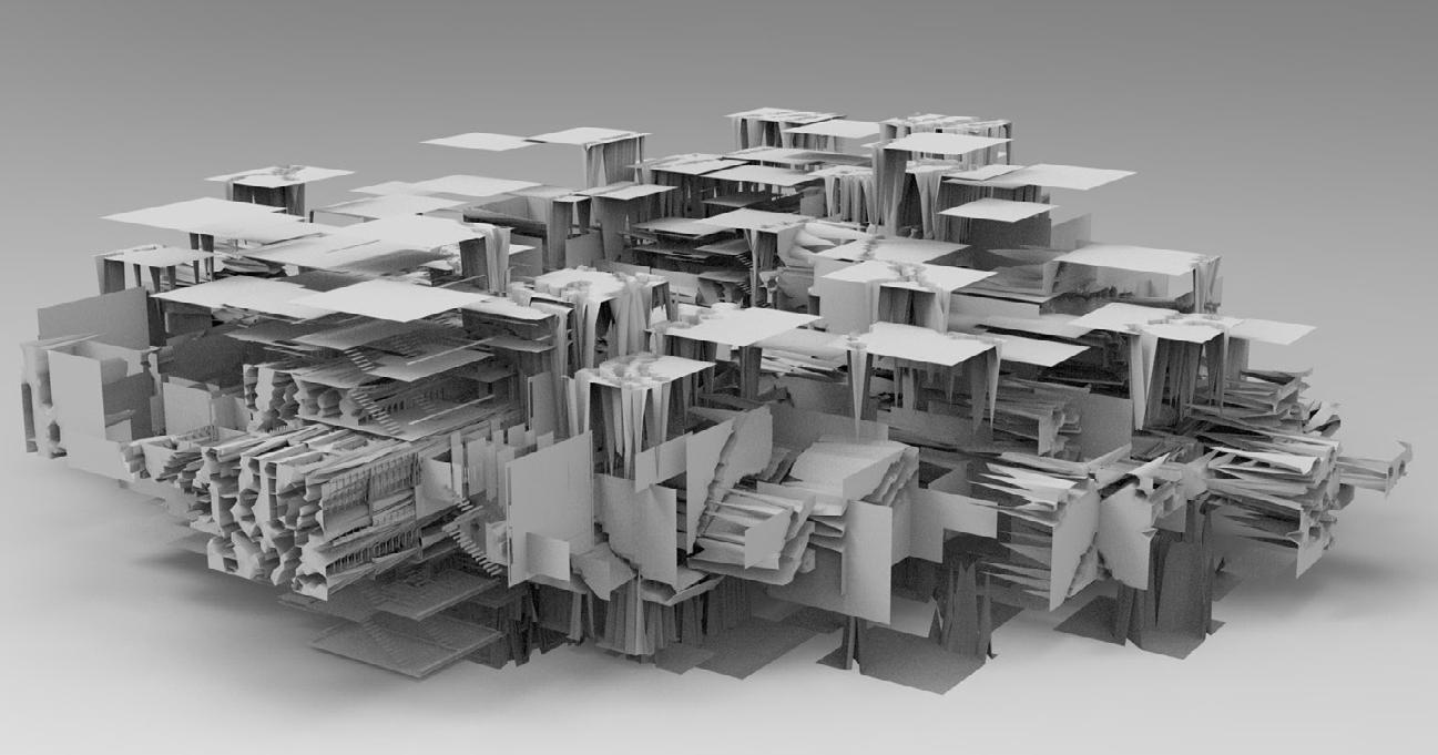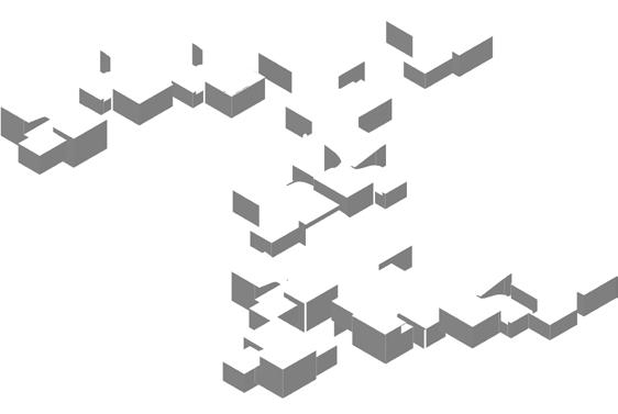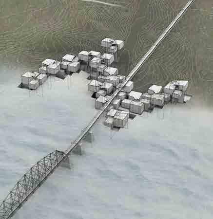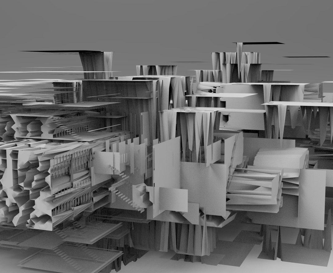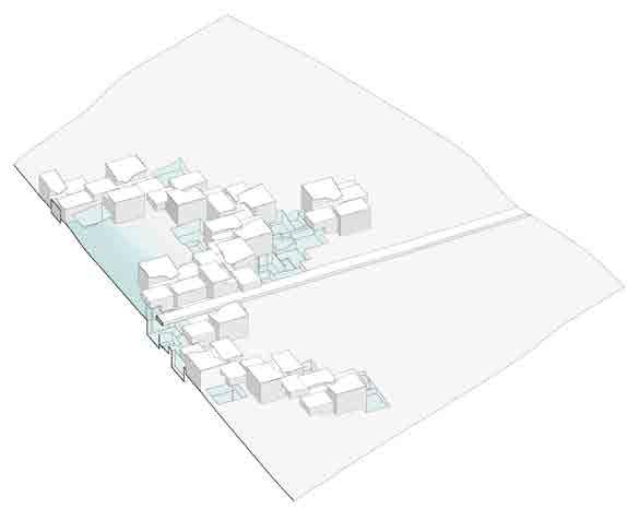 The structure is organized into a double helix, creating two courtyards, one public and one private. From the bridge, visitors are first given access to the rooftop terraces before being led into the public courtyard. The overlap of the two helixes are thickened and raised in order to give privacy to the private courtyard that opens up into the river. Here, the proximity to the water creates a floodable plane that accounts for swells in water level and brings water into the lives of the residents in the form of a larger body of water. The structure is held up by a system of walls that extend from within the units, helping to define the plan, to within the ground, helping to funnel the water and create a closed geothermal loop that powers the system. The water is funneled into a series of cavities that mirror the language of the system above.