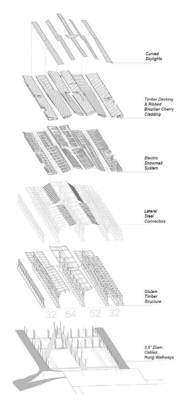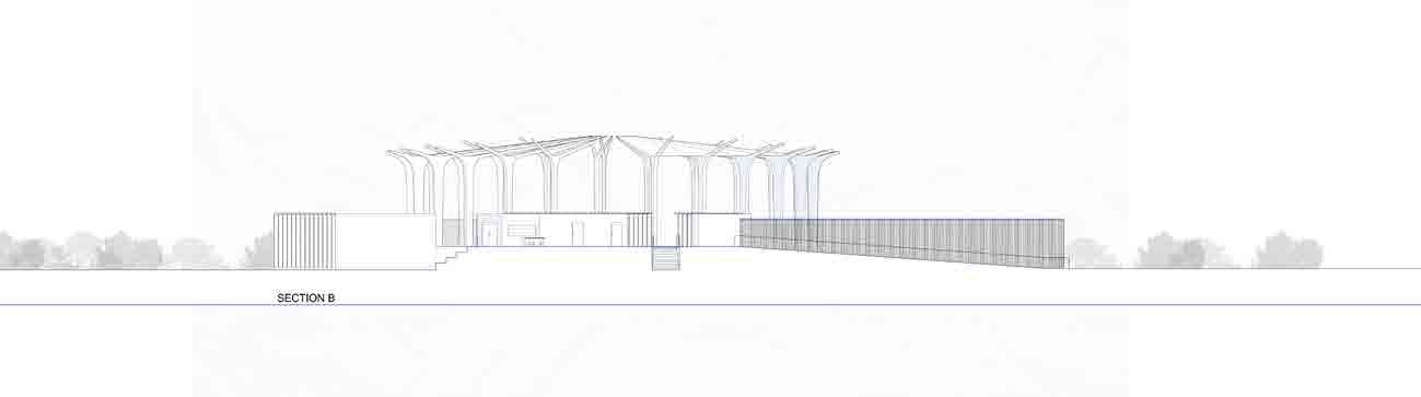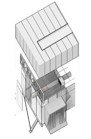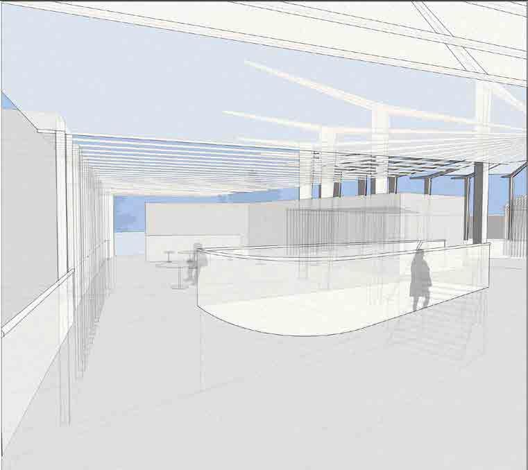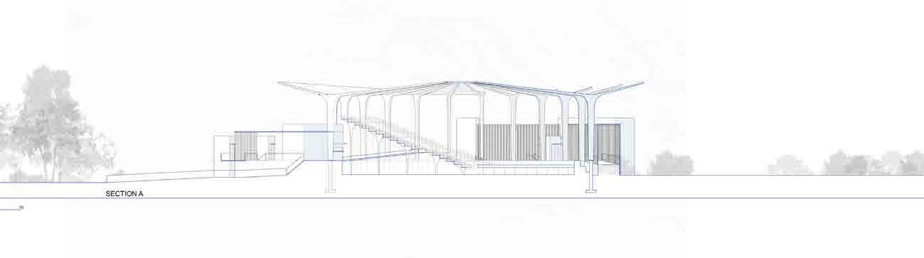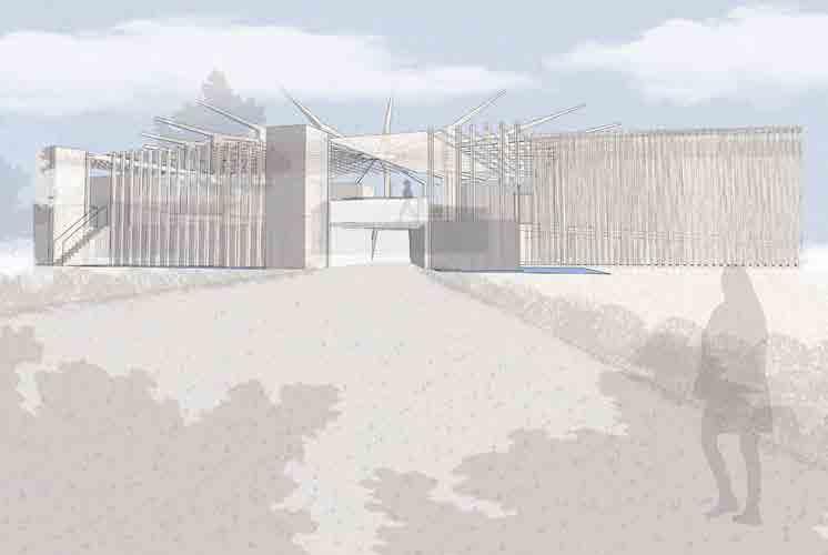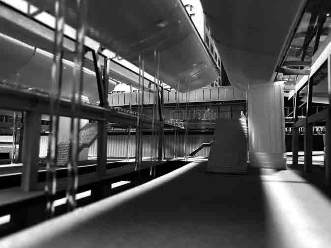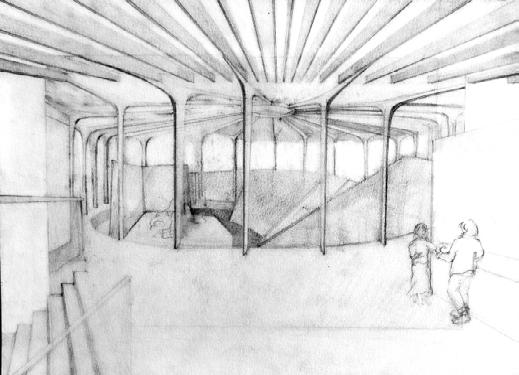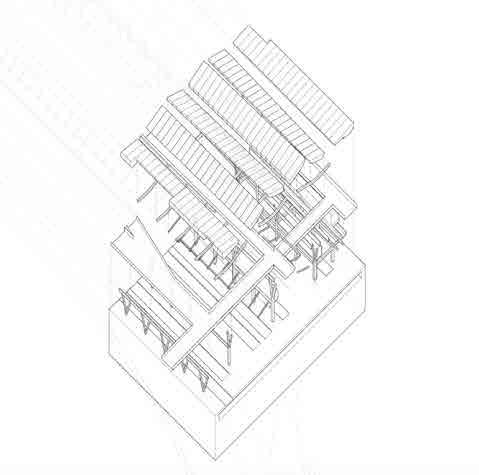 The tectonics of the seaonal theatre consist of an array of wooden structures that create the entry and cafe areas of both the front and back of house. Both ends of the theatre also hold an enclosed space for the kitchen in front of house and dressing rooms in back of house. The front and back of house are joined by the house of the theatre, an open space surrounded by mass timber beams that can enclose areas of the theatre as needed.