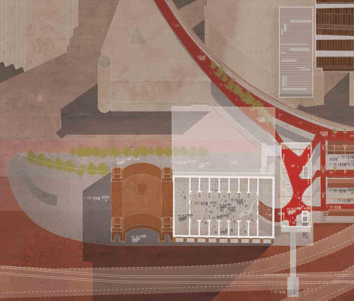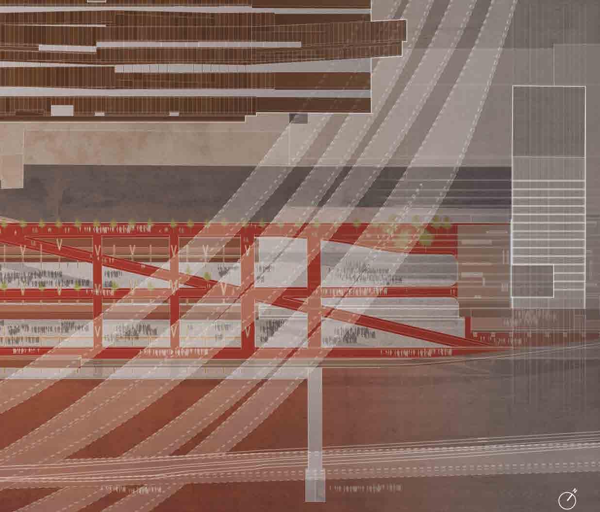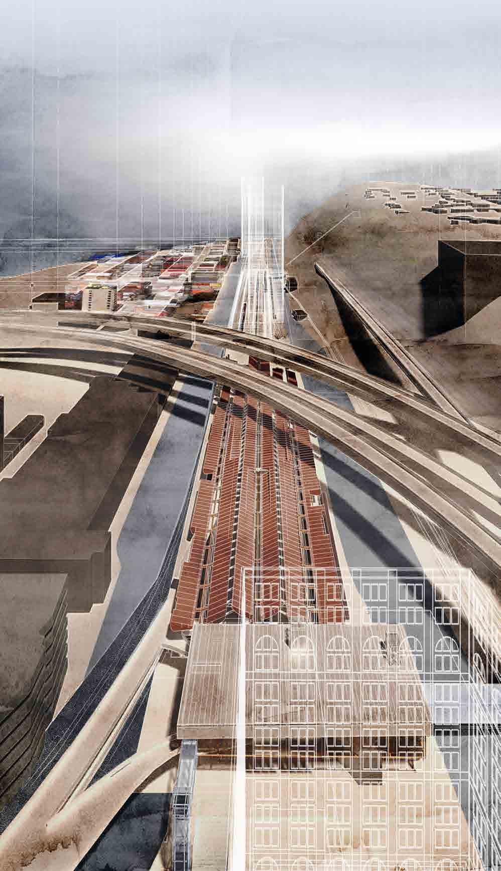 This project investigates what it means to design a space for public transit while grappling with uncertain futures as our cities continue to change. Nestled at the nexus of three of Pittsburgh’s most historically significant neighborhoods: the Strip, Hill, and Golden Triangle Districts, the present Amtrak station exists at an inaccessible “nowhere place.” Through time, the destructive effects of the construction of the I-579 highway system and redlining have produced a zone of unstable urban development. This scheme creates an elevated pedestrian ground which stitches together the fabric of these three neighborhoods. Elevated walkways forge a walkable connection beginning with the Burnham rotunda and progressing all the way to the proposed revitalization of the historic funicular at 16th Street, relinking the Hill and Strip Districts as before the construction of the interstate.