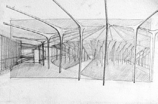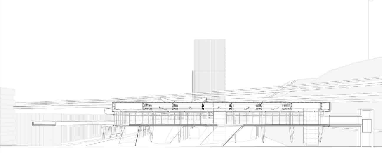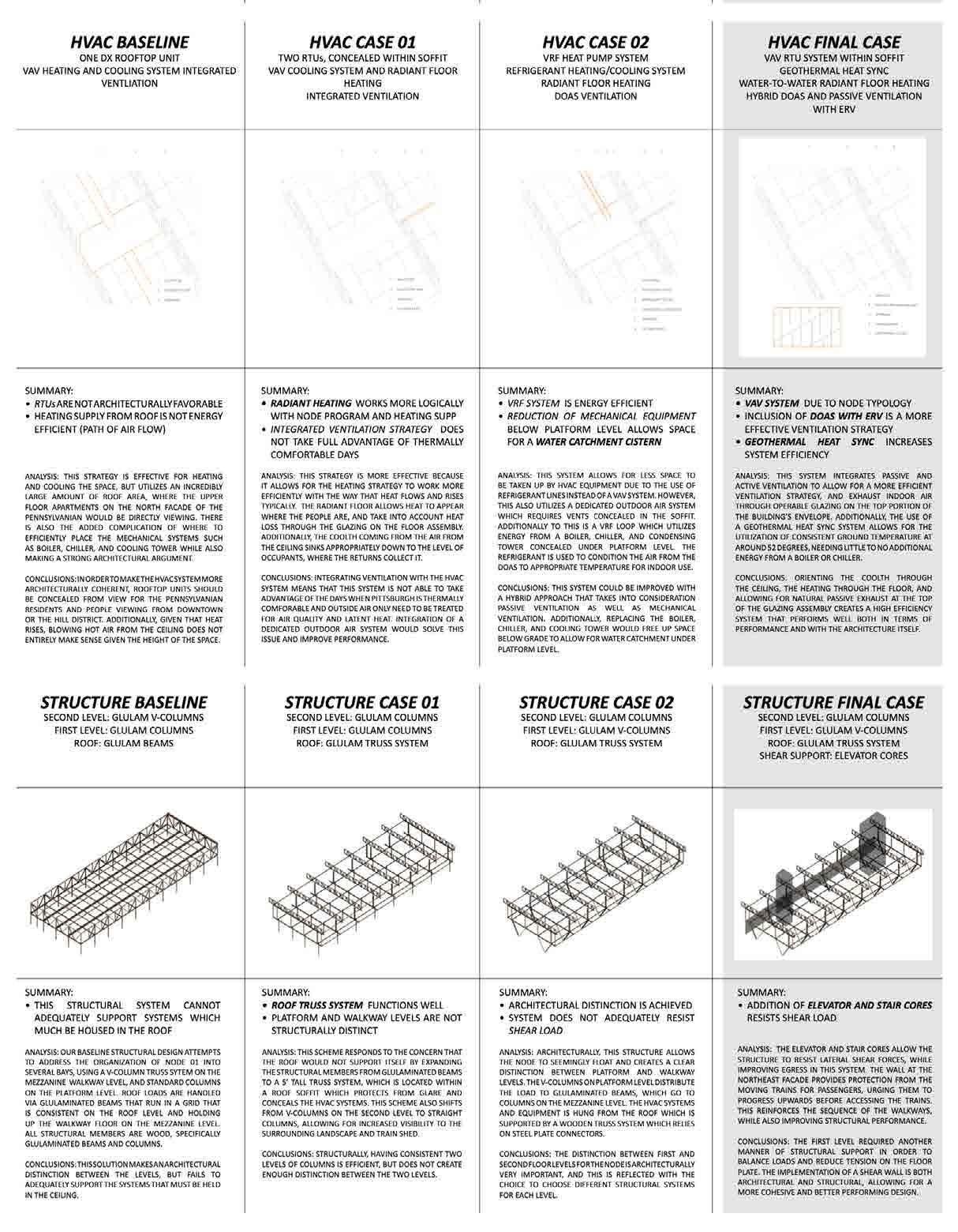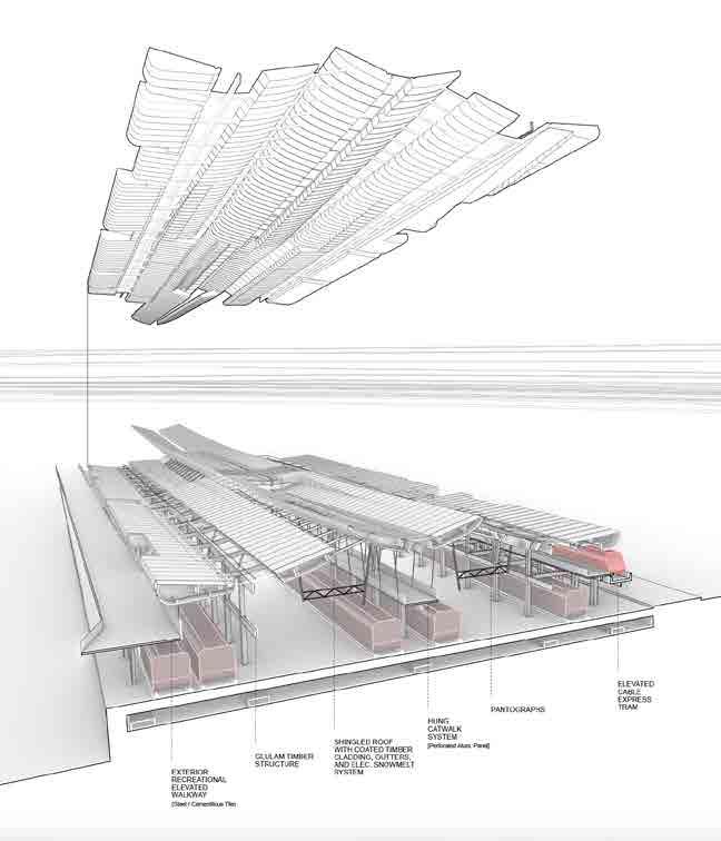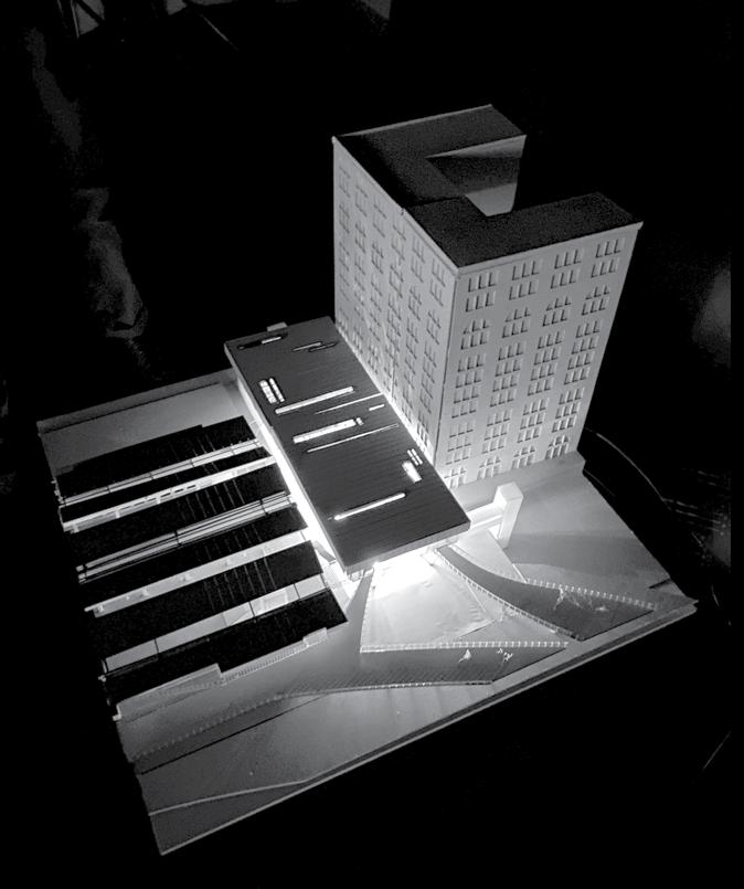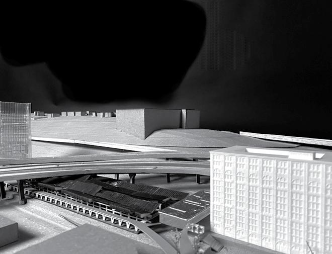 This project investigates what it means to design a space for public transit while grappling with uncertain futures as our cities continue to change. Nestled at the nexus of three of Pittsburgh’s most historically significant neighborhoods: the Strip, Hill, and Golden Triangle Districts, the present Amtrak station exists at an inaccessible “nowhere place.” Through time, the destructive effects of the construction of the I-579 highway system and redlining have produced a zone of unstable urban development. This scheme creates an elevated pedestrian ground which stitches together the fabric of these three neighborhoods. Elevated walkways forge a walkable connection beginning with the Burnham rotunda and progressing all the way to the proposed revitalization of the historic funicular at 16th Street, relinking the Hill and Strip Districts as before the construction of the interstate.