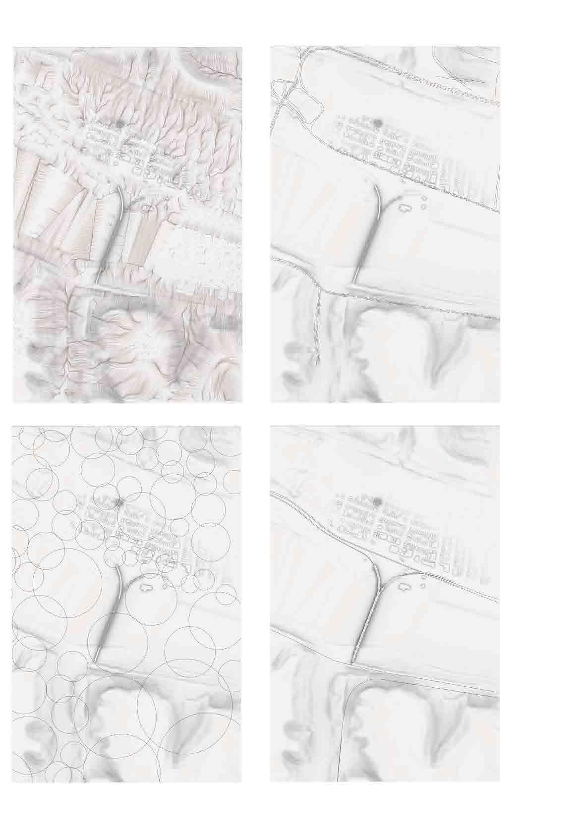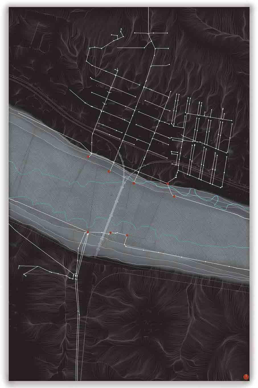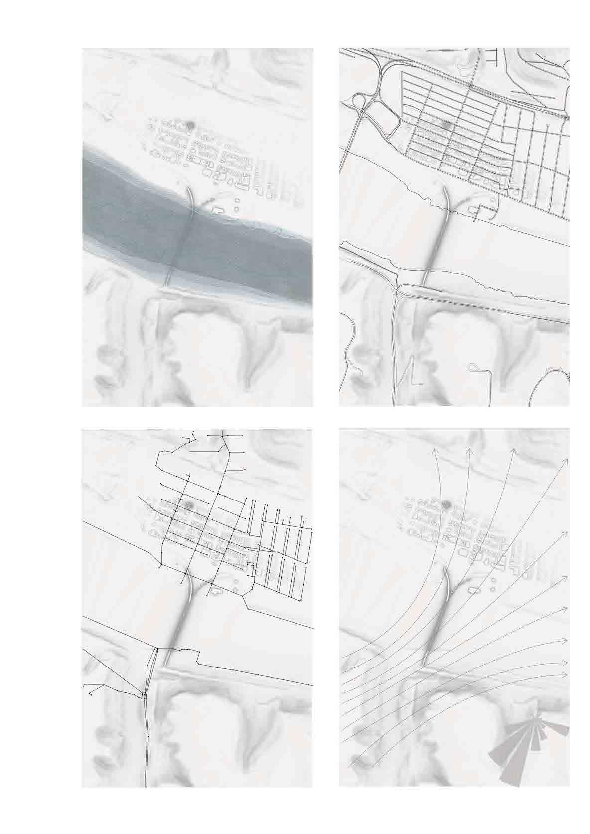 Spillway house begins by studying the site context through a set of maps that highlight key points of the neighborhood and landscape, focusing on the hydrology of the region. The topography changes in the area suggests that a system can be implemented to create a more structured flow of water that aims to benefit the neighborhood. Sewage outlets that empty into the river show the need for a cleaner and more sustainable way of processing waste.