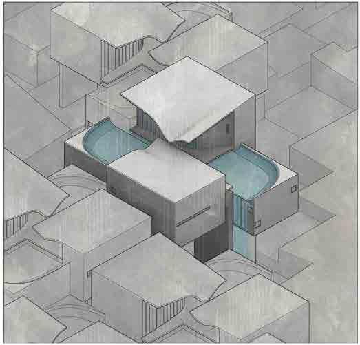 The design looks at the Narkomfin Building in Moscow as a precedent in reconfiguring the existing social structure and gender roles through its program and shared spaces. In a similar fashion, the Spillway House intends to break the stigma of water processing as an undesirable task most commonly associated with areas of minorities and lower income. Here, the entire structure takes on the role of water filtration and collection, recognizing it as an integral part of society.