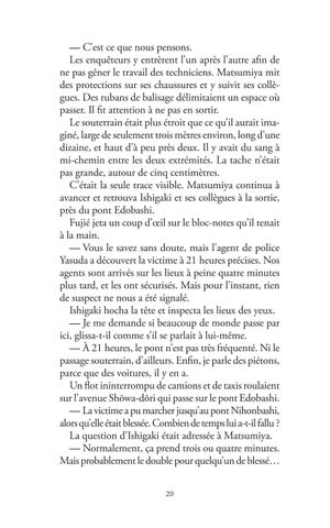 Matsumiya et Kobayashi jetèrent un coup d’œil à l’in térieur du poste de police au pied du pont. C’était là que travaillait Yasuda, l’agent de police qui avait découvert la victime.Celui-ci, qui ne devait pas avoir plus de trente ans, accueillit ses deux collègues venus de la préfecture de police avec une tension visible. Sa main tremblait légèrement quand il les salua.