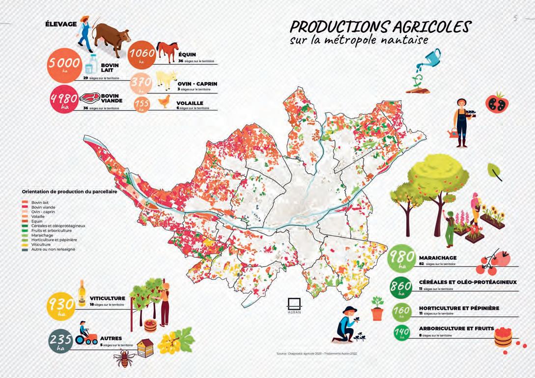 État des lieux de la production agricole sur le territoire nantais tiré des Synthèses de l’Auran, n° 81, pour Nantes métropole. L’étude montre une préservation et une bonne diversification de la production, mais des difficultés à progresser.