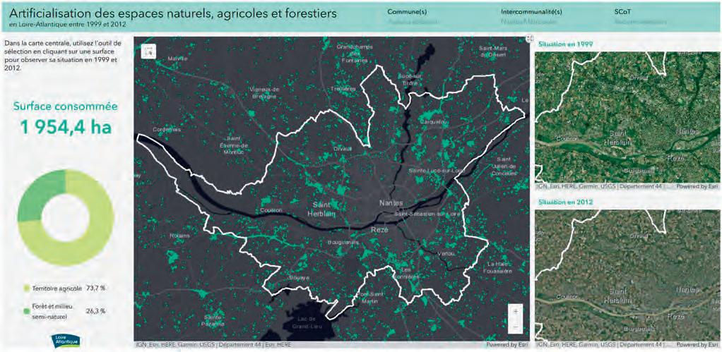 Les cartes interactives de l’occupation du sol de Nantes métropole montrent en pixels verts les surfaces agricoles consommées en treize et huit ans, soit un total de 4,8 % de la superficie de l’agglomération, avec un ralentissement de la vitesse de consommation par deux entre 1999 et 2020.