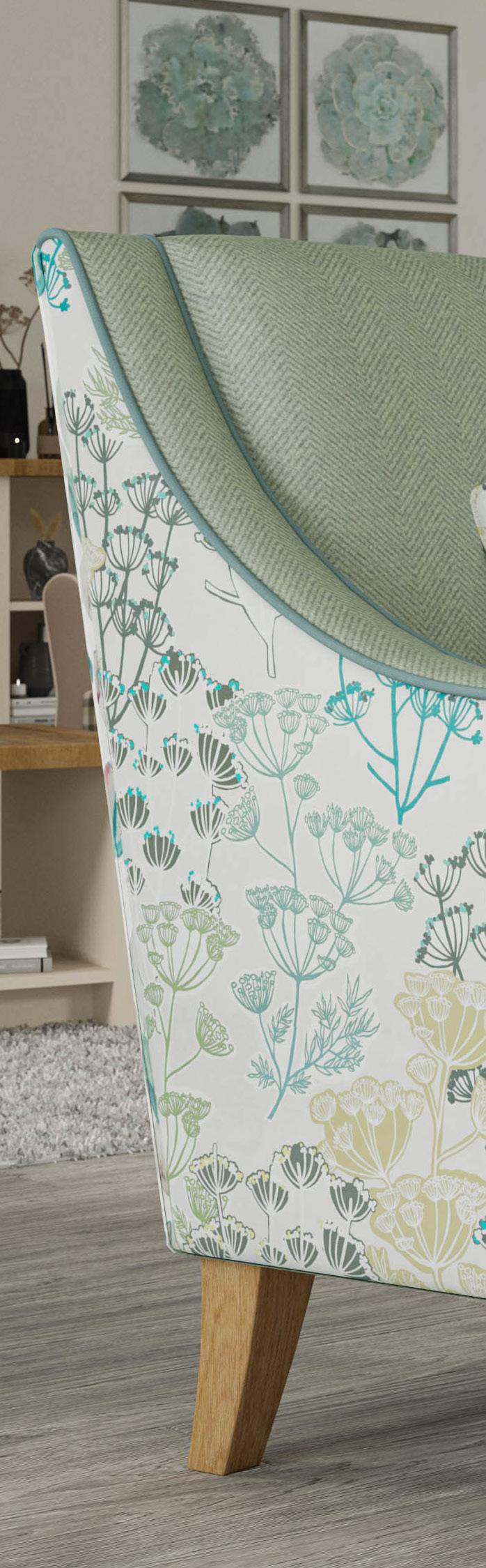 Inspired by art and nature, featuring painterly floral patterns with rich hues of emerald green and blush. SEATING