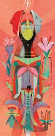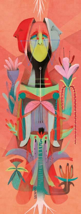 Ces réflexions, qui ne visent pas à idéaliser ou diabo liser l’une ou l’autre des parties, mais à définir une position critique, seront ma boussole pour développer les illustrations des articles de ce magazine. Heureu sement, mes sentiments et les dissertations écrites s’accordent parfaitement. Avec une liberté créative et une résonance idéologique, je décide d’utiliser le masque blanc comme un symbole de la colonisation qui impose, fracture et emprisonne. Graphiquement, la décolonisation sera la représentation d’une pléni tude « humaine » non symétrique (c’est-à-dire non stéréotypée) avec des traits libres, la nature, des cou leurs dynamiques et des formes joyeuses qui s’étalent sur la toile, brouillant les frontières entre l’individu et l’espace. Les silhouettes qui font allusion au tribalqui est essentiel -, évoquent également la festivité qui découle du fait de savoir vivre en équilibre.