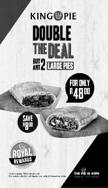 • E&OE • We reserve the right to limit stocks • Prices valid while stocks last • Pictures may differ from actual product. SPECIALS FROM 29 Sept - 5 Oct 25 Nelson Street 044 382 3510 13 Long Street 044 382 0241 20 Grey Street 044 382 0771 3 for R99.99 3 for R24.99 R79.99 R29.99 R32.99 R49.99 R12.99 R19.99 Pack of 5 R19.99 R99.00 R459.99 R639.99 Folding Doors Promac Rubber Duck Liquid Rubber 5LT Vida Moulding 2 x 250ml Smile Toilet Paper 10s Rosemary Oil Moist 250ml PC Oil Sheen Spray Clere Body & Hand Wash 200ml Clere Body Lotion 400ml 10L Bucket Rice, Flour, Mieliemeal Sky Washing Powder 2kg Vida Edge Gel 125ml FULLTAKE-AWAY MENU AVAILABLE R19.99 Dry n Free Nappies RR19.99 6.99 Cerebos Noodles Mugs R59.99 The Magic Porcelain Adhesive 20kg PPC Surecem 50kg From R179.99 Corrugated Iron Sheets 0.22mm Shutterply Board 2440 x 1220 x 18mm R989.99