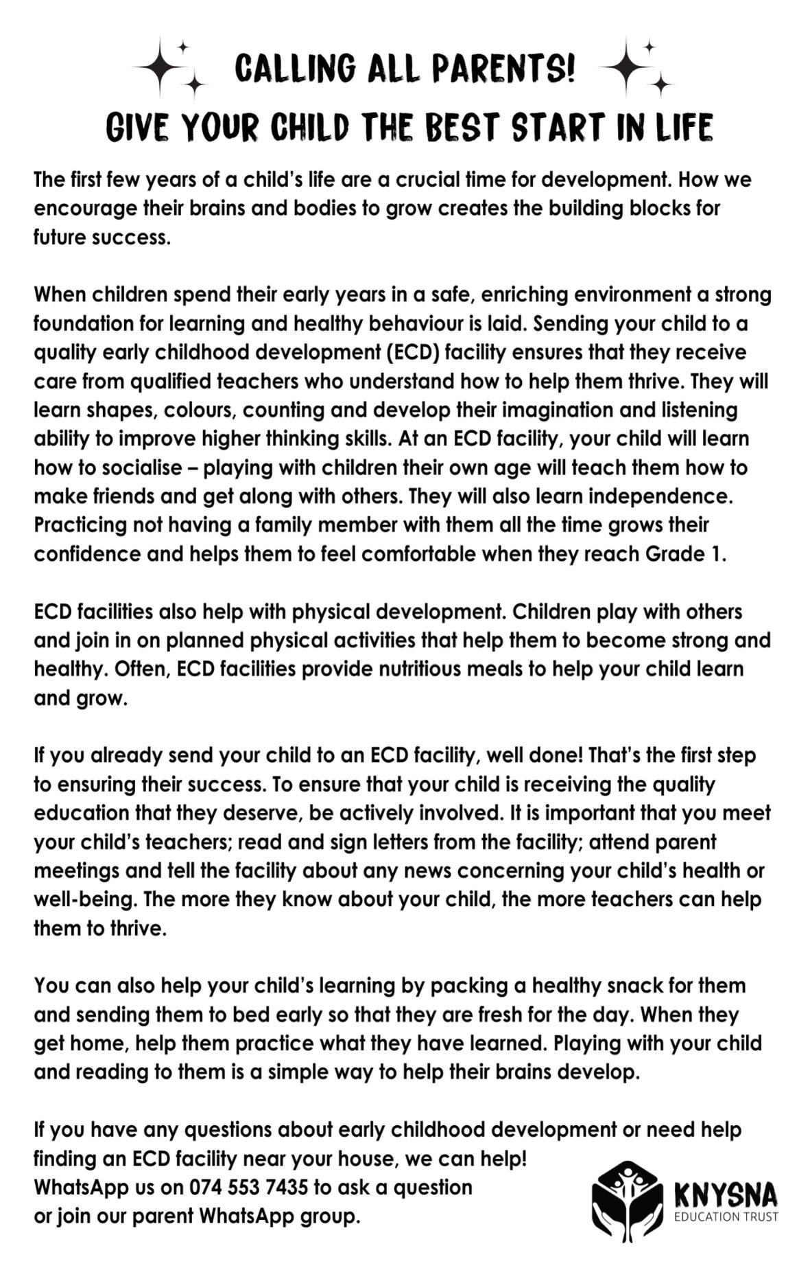 AANSOEKE OOP VIR AFRIKAANSE LEERDERS 2023 • Vakansie sorg • Ontbyt en middagete • Ons volg die WKOD kurrikulum • Groot speel area & fantastiese geriewe • Halfdag en Voldag opsies • Gekwalifiseerde Onderwyseresse en Assistente Kontak ons vir meer inligting of kom maak ‘n draai en sien wat ons als aanbied. ENIGSTE Voeder skool vir Laerskool Knysna 044 382 6915 preprimary@knysnaprimary.co.za www.knysnaprimary.co.za