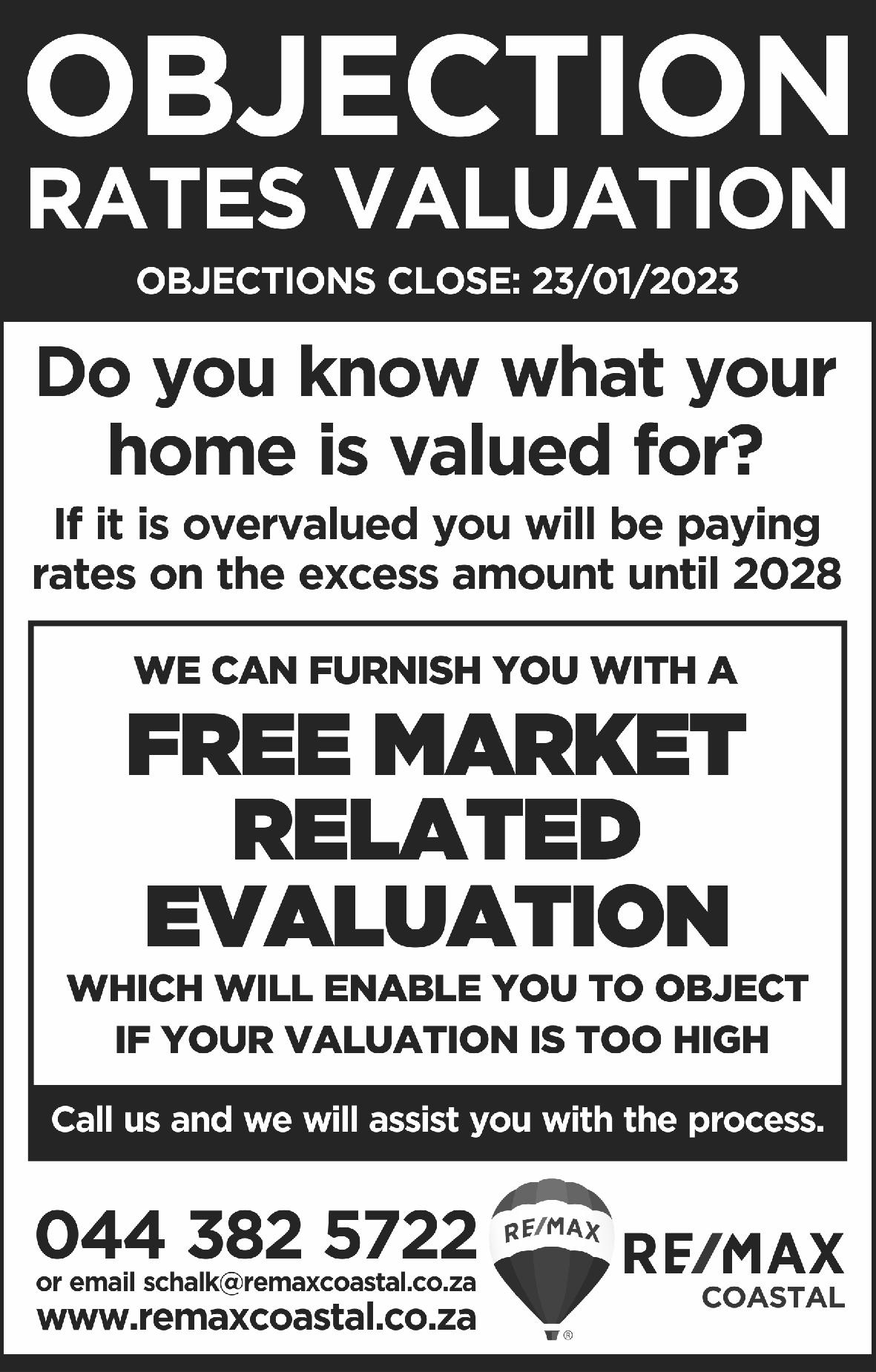 RE/MAXJOUEERSTEKEUSEasjyjou huis wil verkoop. Gratis evaluasie. 0 4 4 3 8 2 5 7 2 2 o f www.remaxcoastal.co.za