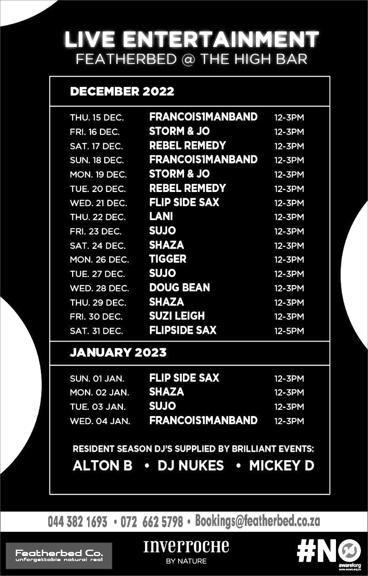 meal R290 p/p Thursday, 22nd December 2022 18h00 for 18h30 Bookyourtabletoavoid disappointment.