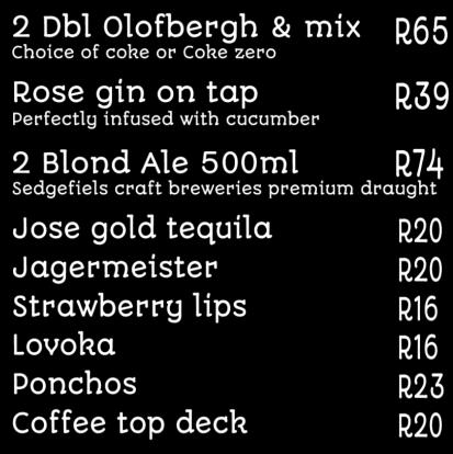 W E E K E N D S P E C I A L S Vandieplaas nadietafel Fromthefarm tothetable THIGHS WAGON WHEELS PORK BRAAI CHOPS BREASTS BULK PORK CHEESE WORS PORK POTJIE .95 R59 P/KG .95 R69P/KG .95 R59 P/KG .95 R59 P/KG .95 R59 .95 R39 P/KG P/KG DirectWholesaletothepublic. Whilestockslast. Knysna: 044 382 2402 @ KNYSNA & SAND KRAAL RD KNYSNA’S FRESHEST CHICKEN. Don’tforgetour instoreeveryWednesday WACKYWEDNESDAYS don’t forget! don’t forget!