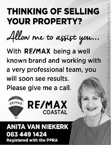 It is never too late to be what you might have been Please support local. Join us for our weekly promotions. Booking essen al. Terms & Condi ons apply. 044 533 2030 l restaurant@plettenberg.co.za WHAT’S ON Afternoon Tea R215pp Curry Promotion R230pp Fish & Chips R200pp Sunday Roast R225pp Mon -Sun Wednesday Friday Sunday O R D E R A N D C O L L E C T 0 6 8 4 0 0 8 8 8 7 O R V I S I T U S AT 5 U I L S T R E E T, K N Y S N A I N D U S T R I A L S O U R D O U G H P I Z Z A A RT I S A N LOAV E S & PA S T R I E S Homebakes ... coming soon! 044 382 2803 WoodmillWalk, Long Str Call Loraine Kaplan for more info 082 651 8258 FOR SALE New Release Stunning lagoon views from this spacious, immaculate 2 bedroom townhouse with large conservatory and deck, single garage and carport. This secure complex is well sought after. R2 650 000 SOLE MANDATE