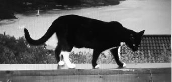 Black female cat with distinctive white markings - right rear leg has white sock
