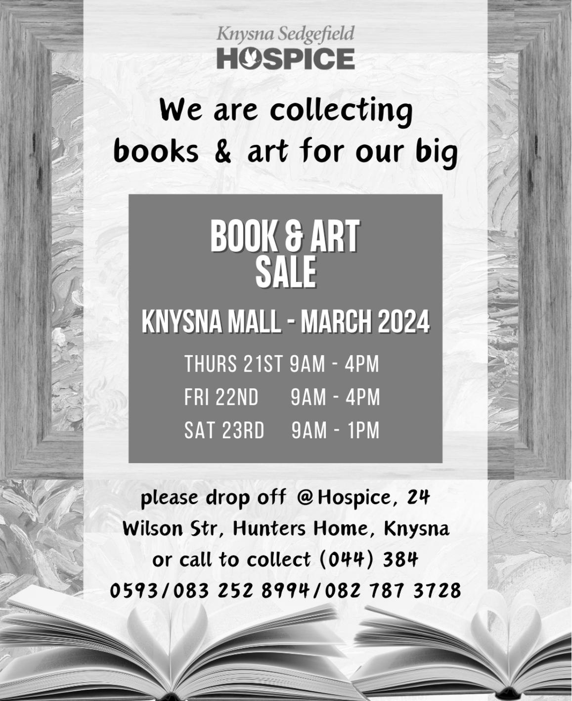 HOSPICE NEEDS BOOKS & ART for our up and coming book & art sale. Please deliver to our offices at 24 Wilson Str, Hunters Home or call (044) 384 0593 / 083 252 8994 / 082 7873728toarrangecollection.Allin supportofpalliativecareinourarea.