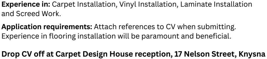 Please note: Make sure a recent photo of yourself is attached to the CV Successful applicants will be contacted. E-mail your CV to: info@opescador.co.za