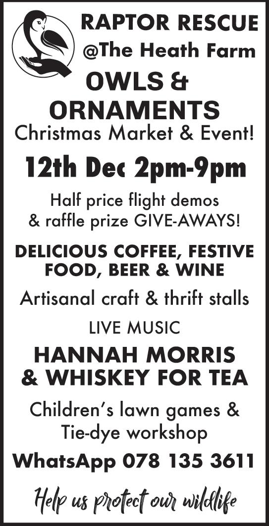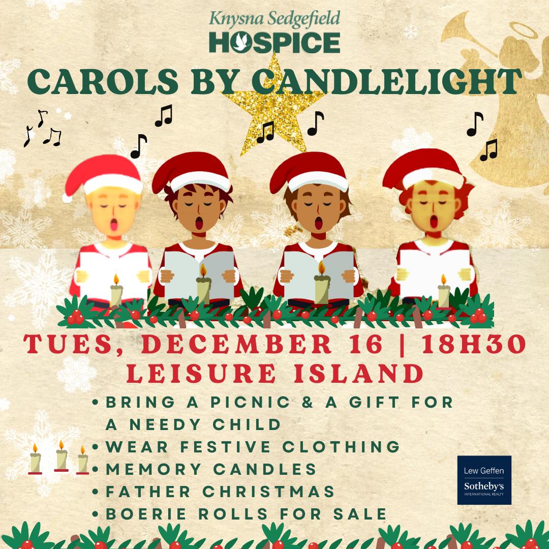 CAROLS BY CANDLELIGHT. Join us for a magical evening on Tues, 16 December at 18h30 for our a n n u a l H o s p i c e C a r o l s b y Candlelight. Bring a picnic and enjoy: A visit from Father Christmas, Beautiful Christmas music, Memory candlestohonourlovedones,Boerie Rolls on sale, please bring along a gift for a needy child (Boy or Girl 2 –15yrs).Allarewelcome!
