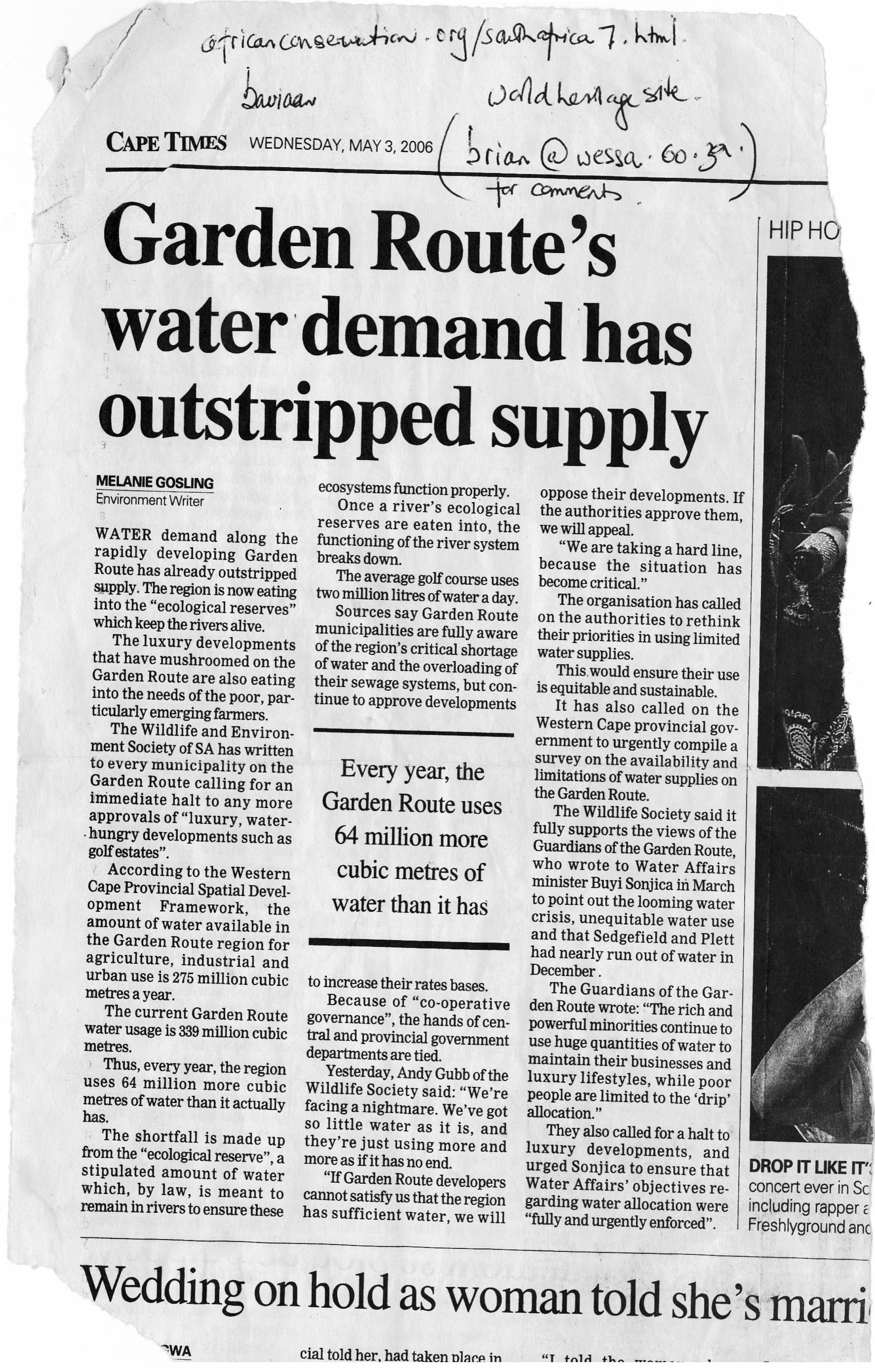 My shout would have been that Knysna Municipality puts a moratorium on approving large developments un l our water supply is secured and water infrastructure upgraded, and the same goes for our sewerage infrastructure.