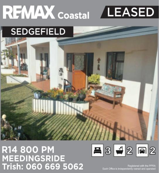 TO LET: Lovely townhouse, 3 bed, 2 bath, open plan living, additional enclosed balcony, lock up garage. In well managed townhouse complex. Fenced and gated secure. Regret no pets. Utilities additional. Rent R16500permonth.ContactGraham REMAX Coastal 064 050 8441 / graham@remaxcoastal.co.za