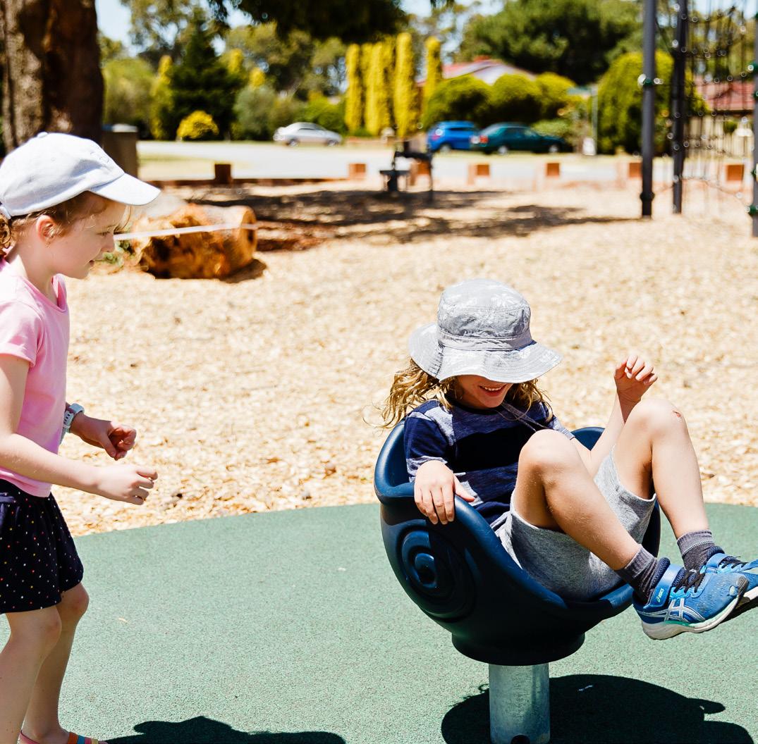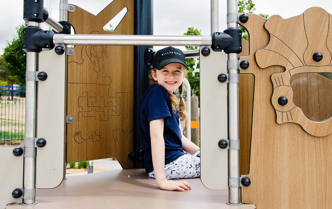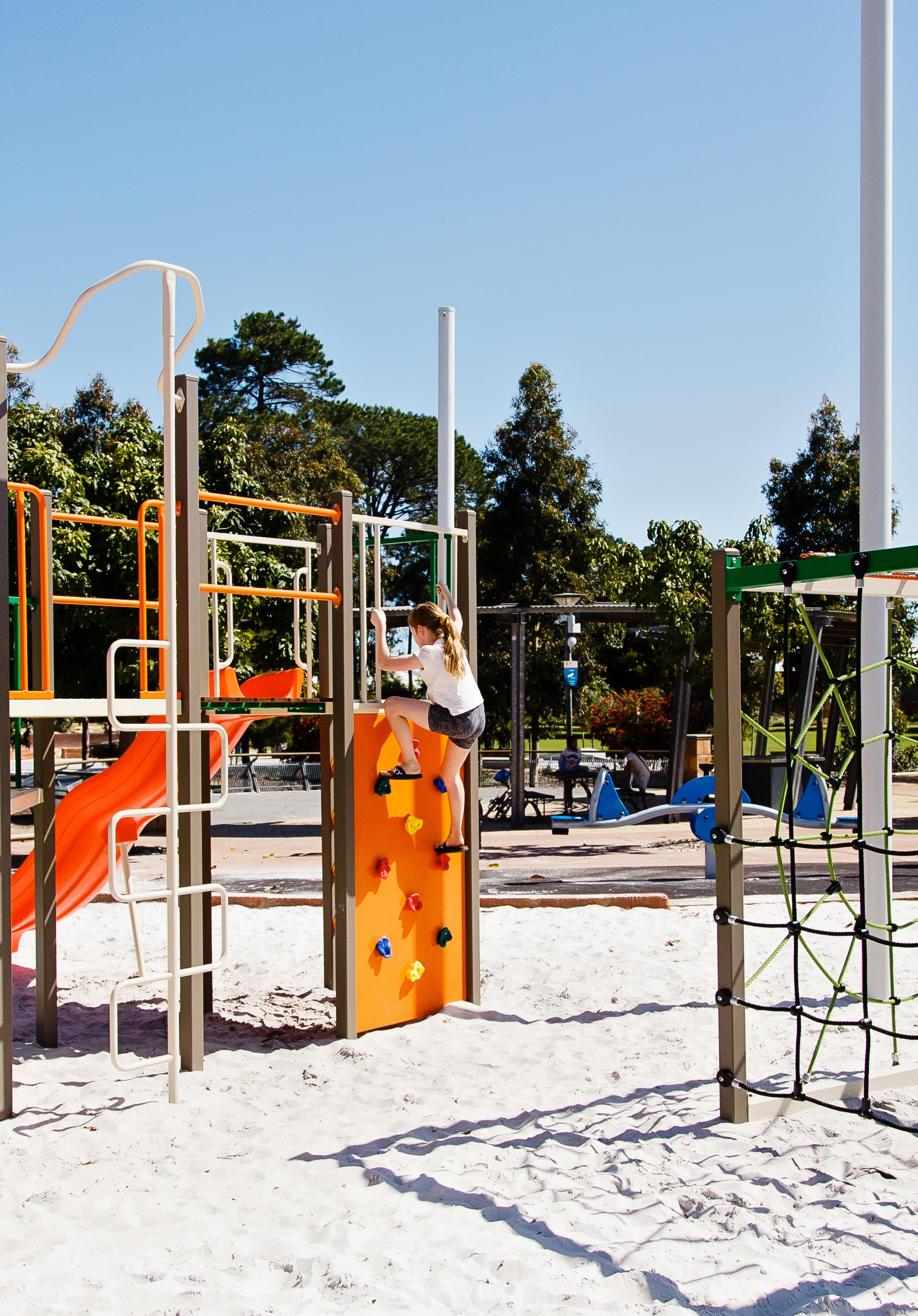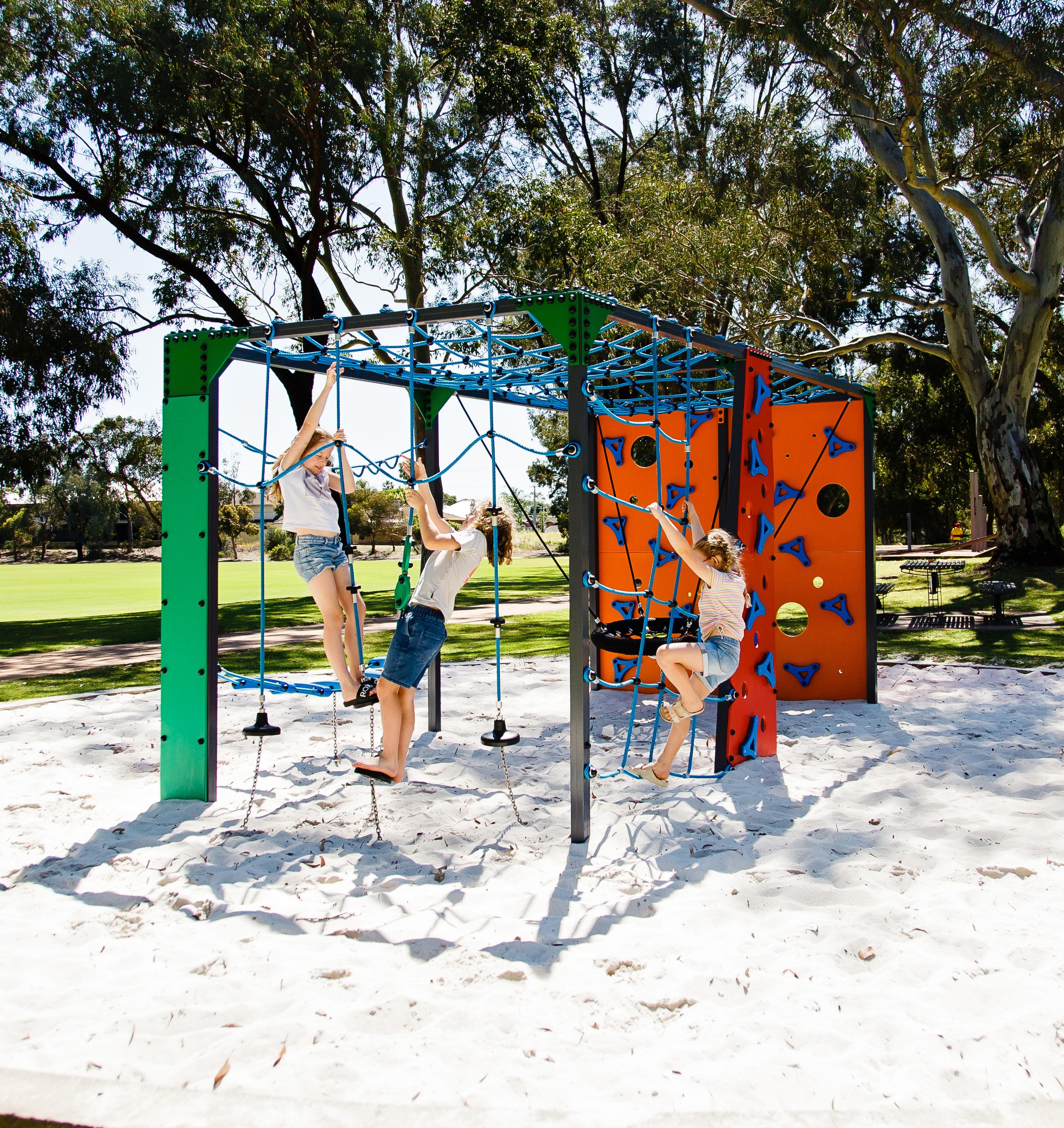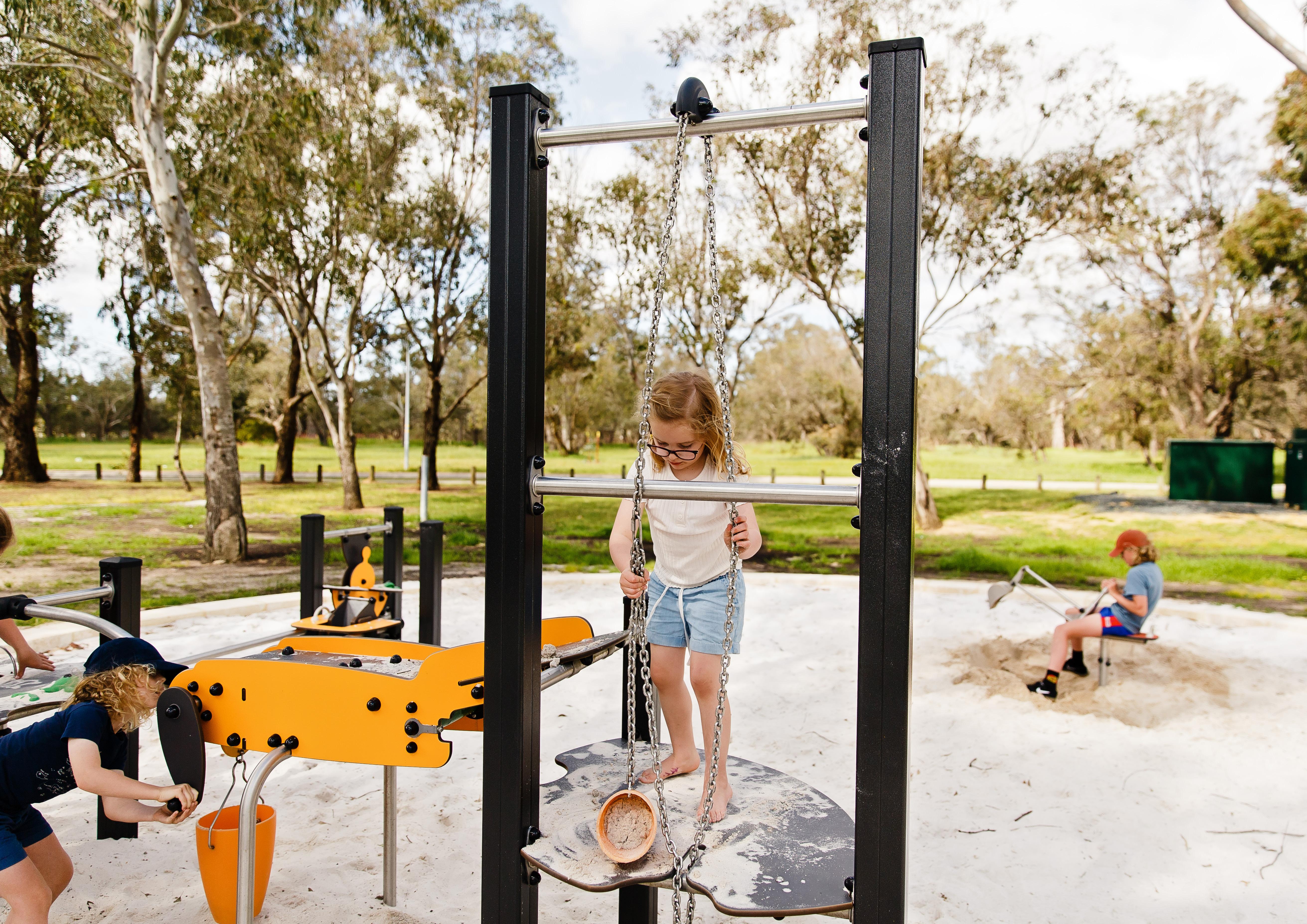 Cantwell Park is bursting with adventure and fun and set against a backdrop of the winding Murray River and surrounded by lush leafy trees. The eye-catching Willplay Spinning Orb takes centre stage, it can accommodate several kids at once and everyone can have a turn to see who can spin it the fastest. Go exploring off-road in the jeep, find the abseil rope and climb to the top of the mountain then slide down! The sand sieve station and range of beautiful Percussion Play instruments throughout the park add a wonderful sensory element to this nature focused playspace