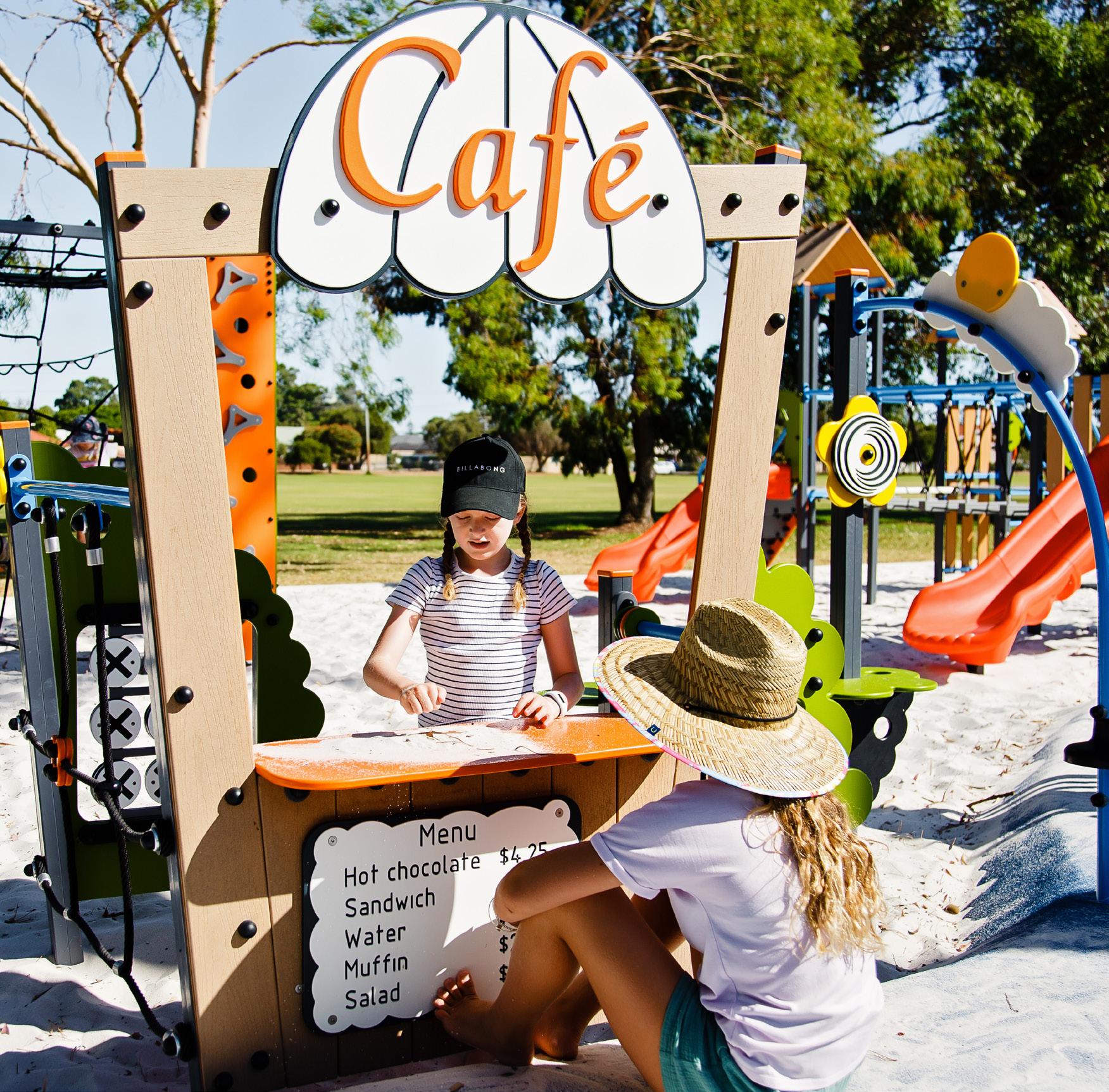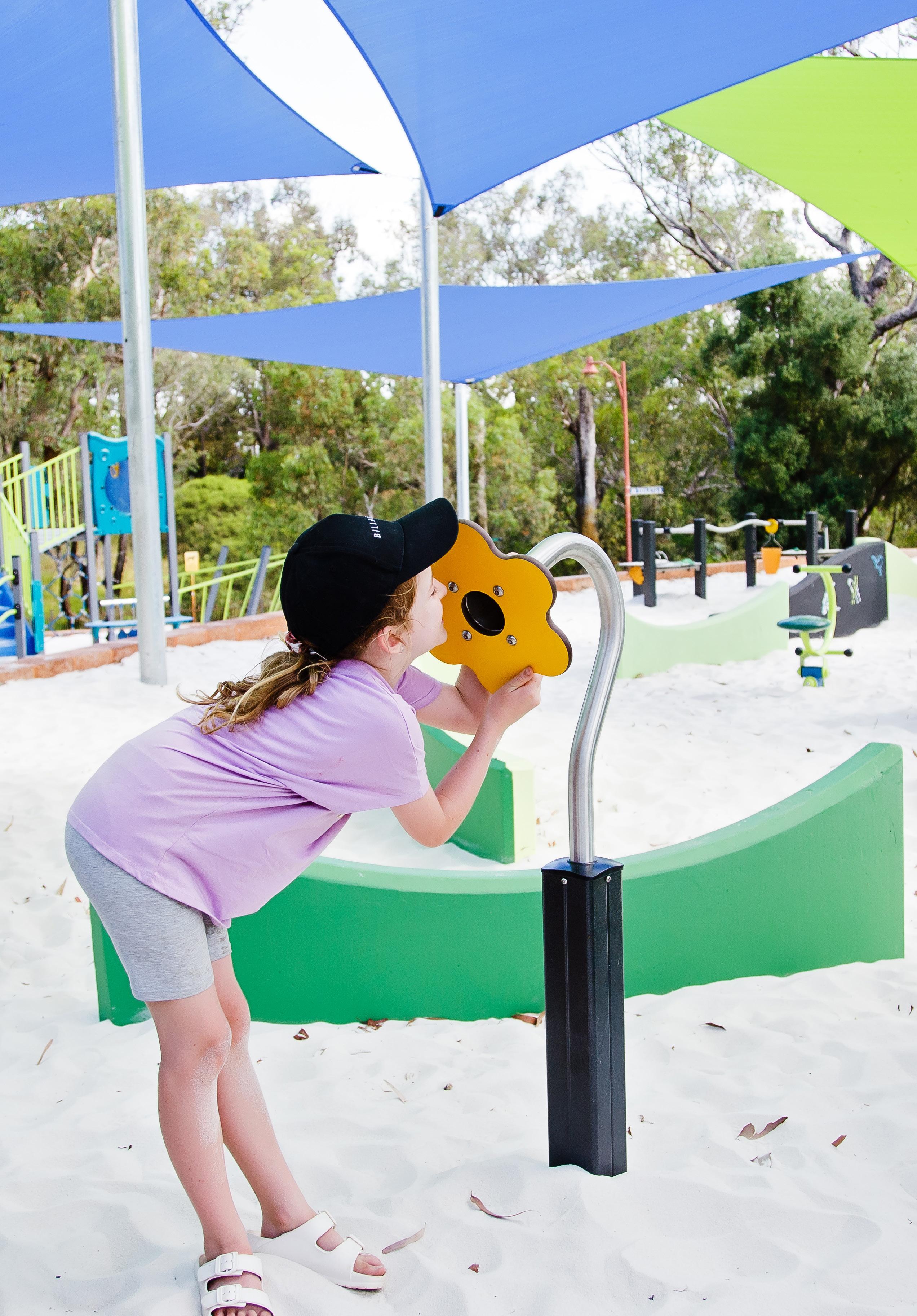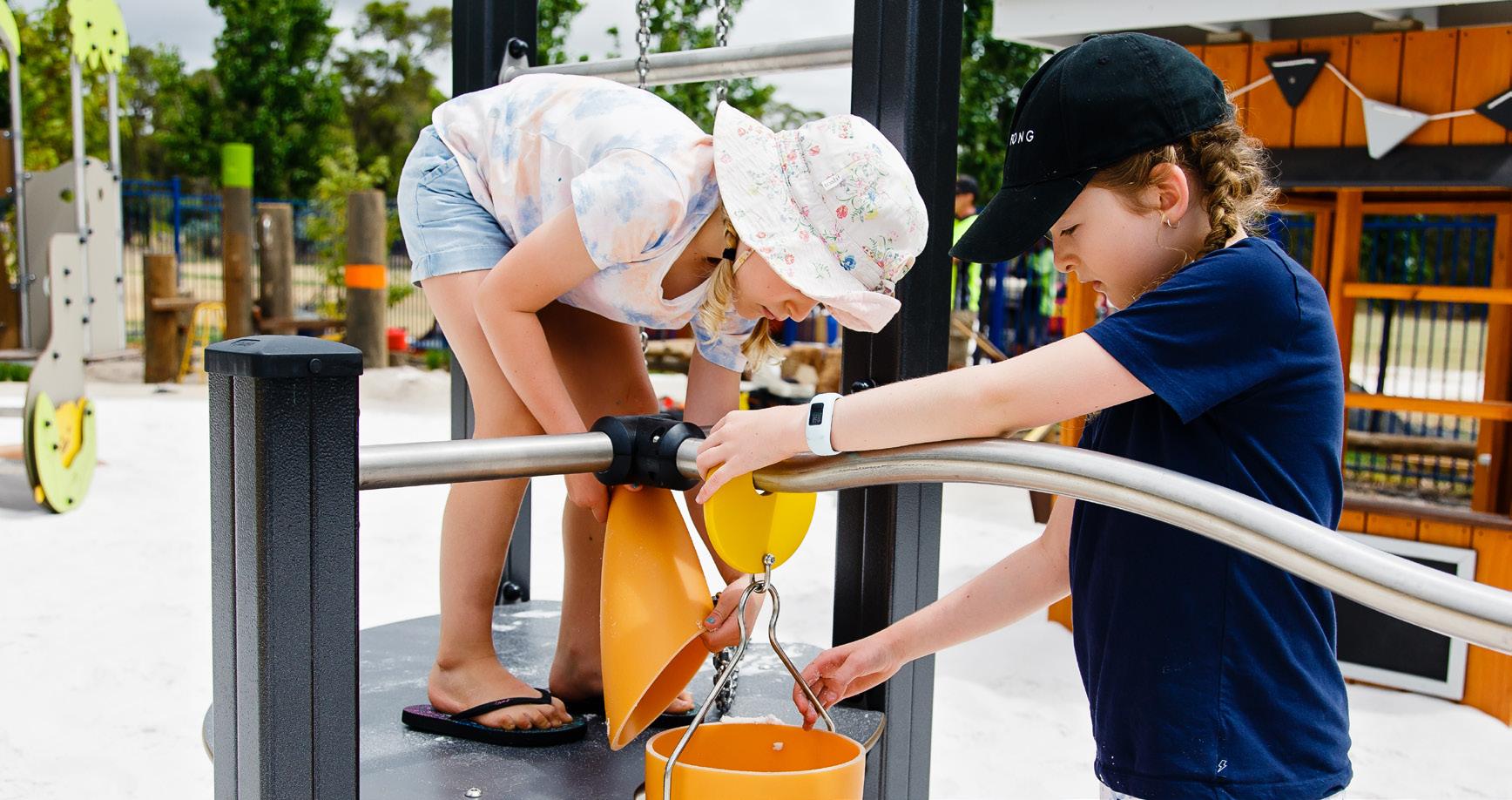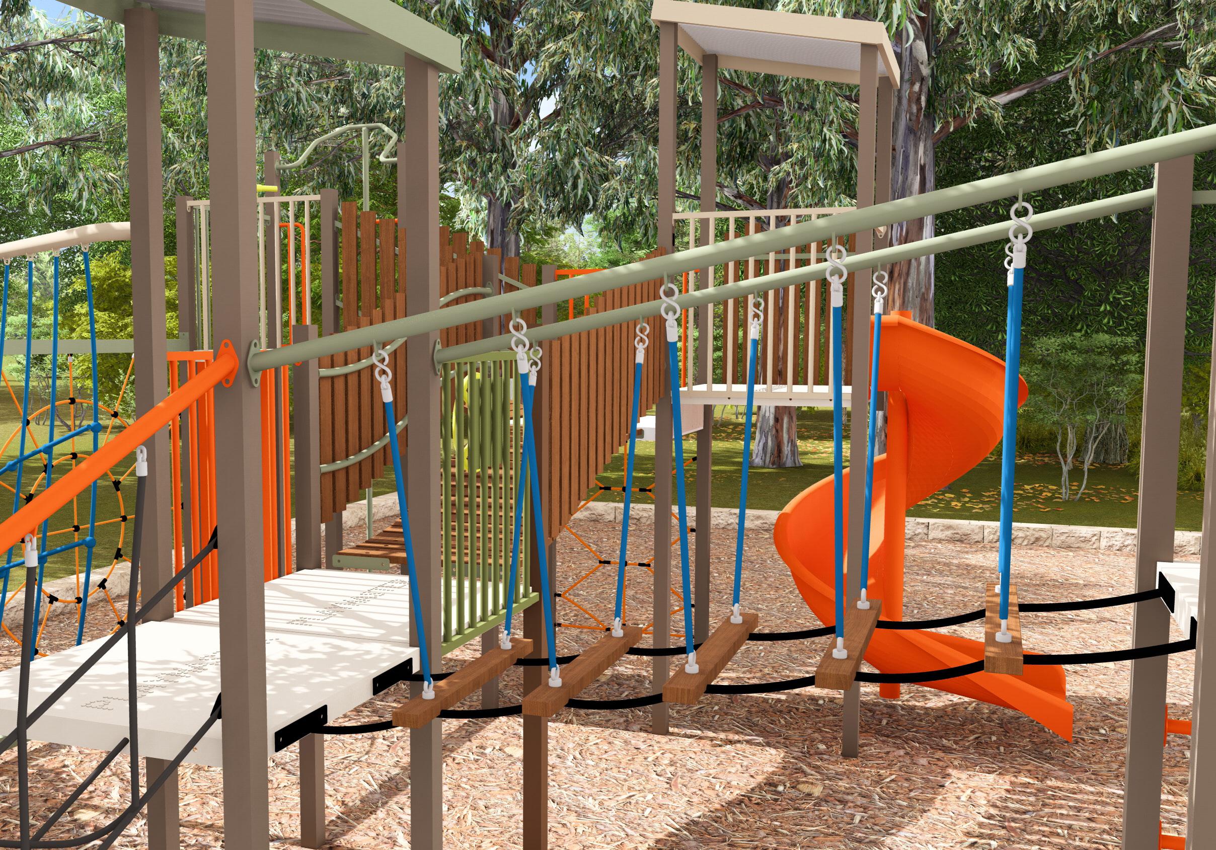 Cantwell Park is bursting with adventure and fun and set against a backdrop of the winding Murray River and surrounded by lush leafy trees. The eye-catching Willplay Spinning Orb takes centre stage, it can accommodate several kids at once and everyone can have a turn to see who can spin it the fastest. Go exploring off-road in the jeep, find the abseil rope and climb to the top of the mountain then slide down! The sand sieve station and range of beautiful Percussion Play instruments throughout the park add a wonderful sensory element to this nature focused playspace