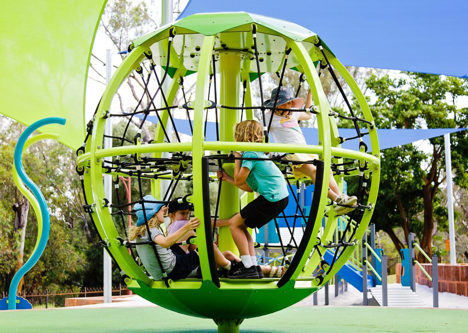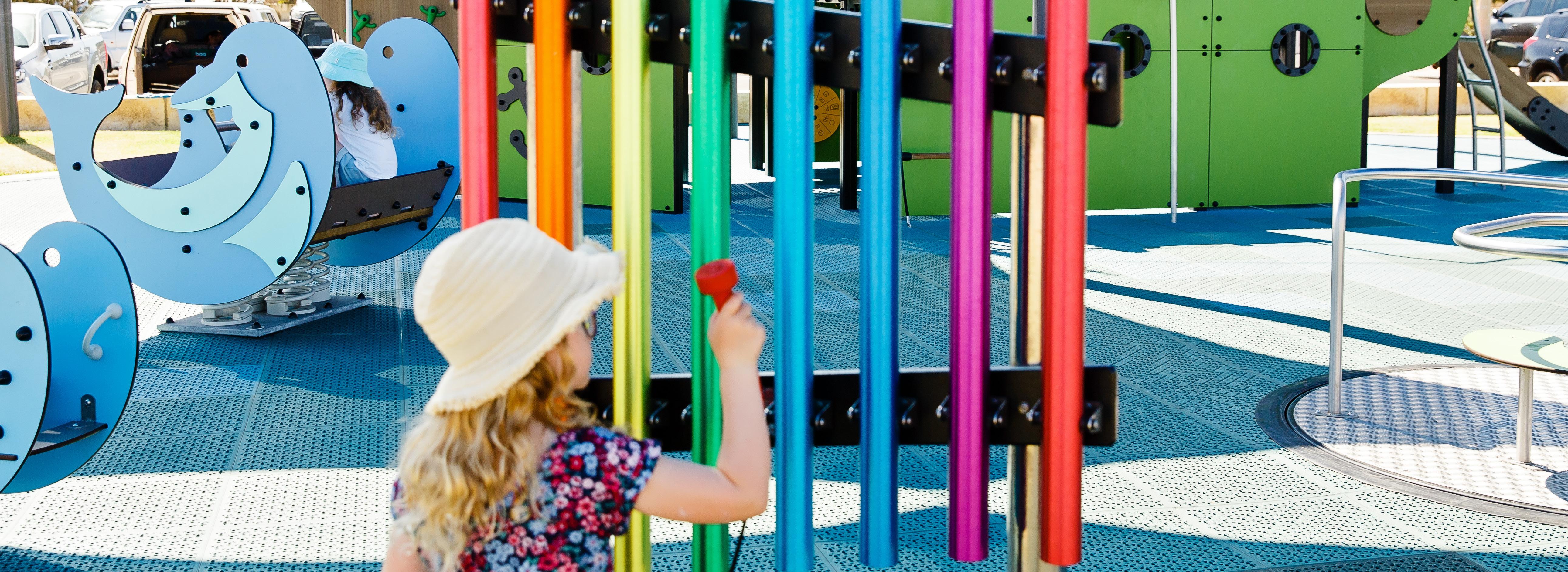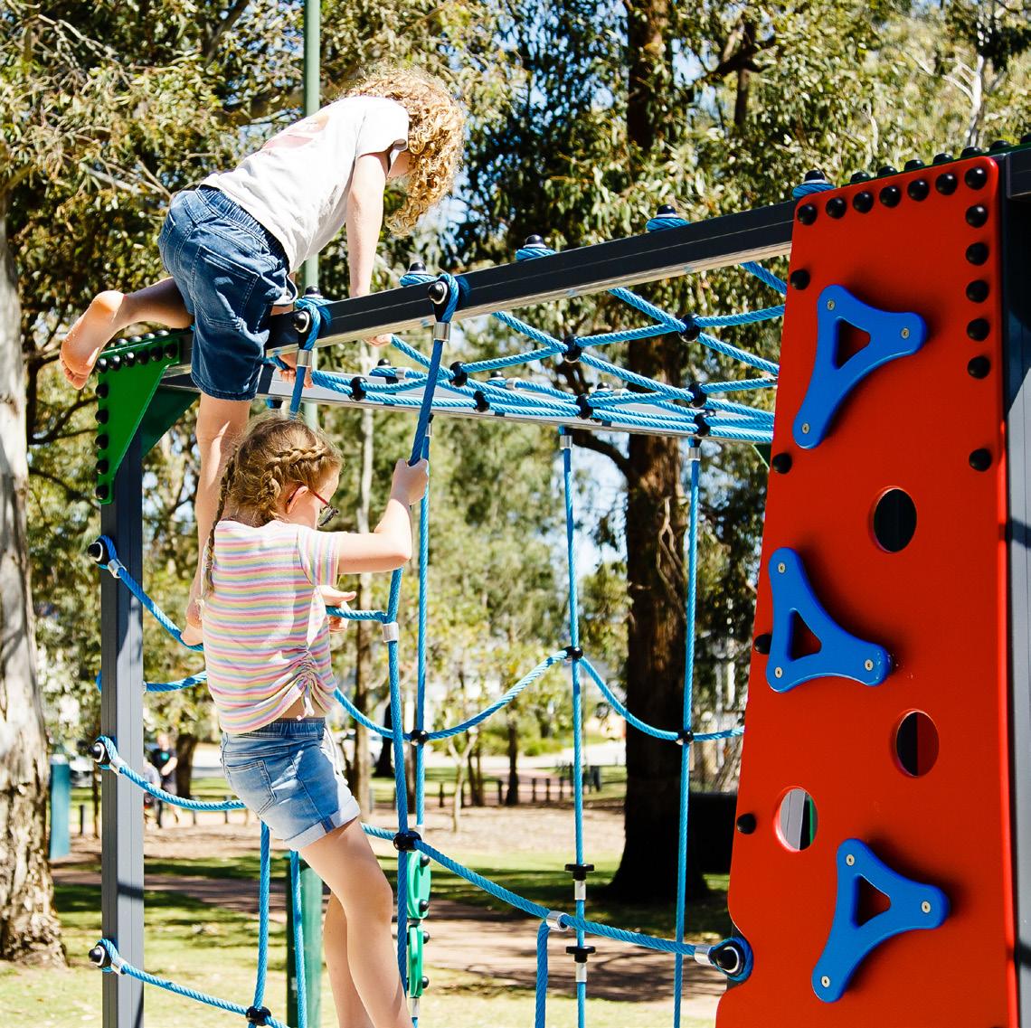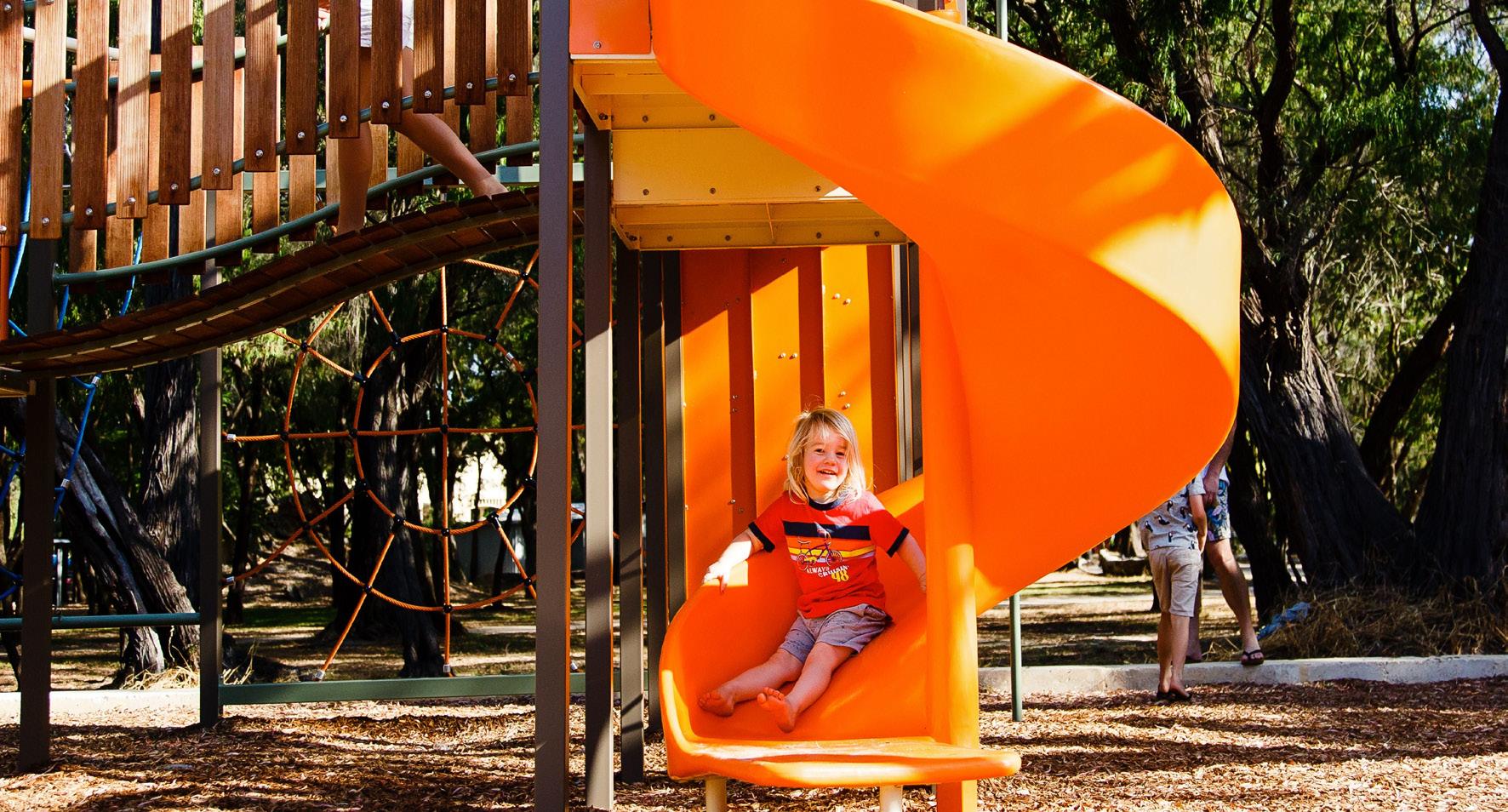 Cantwell Park is bursting with adventure and fun and set against a backdrop of the winding Murray River and surrounded by lush leafy trees. The eye-catching Willplay Spinning Orb takes centre stage, it can accommodate several kids at once and everyone can have a turn to see who can spin it the fastest. Go exploring off-road in the jeep, find the abseil rope and climb to the top of the mountain then slide down! The sand sieve station and range of beautiful Percussion Play instruments throughout the park add a wonderful sensory element to this nature focused playspace