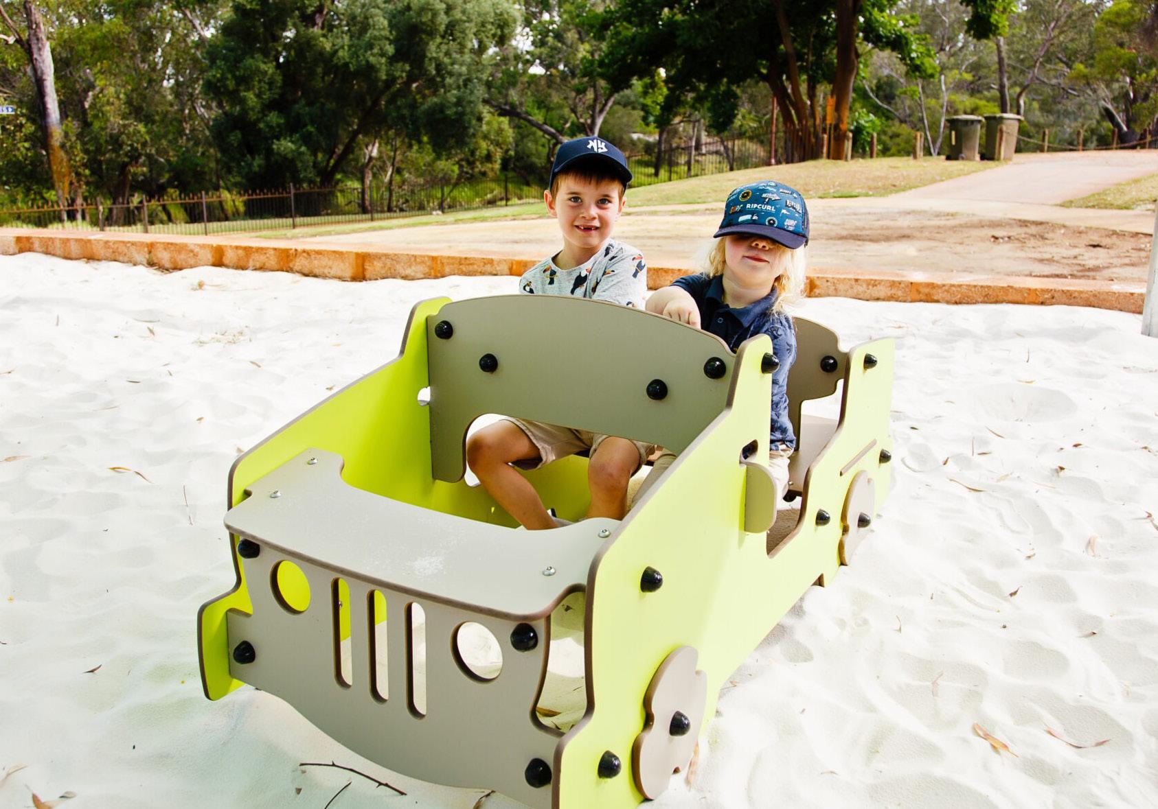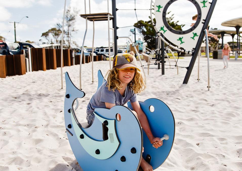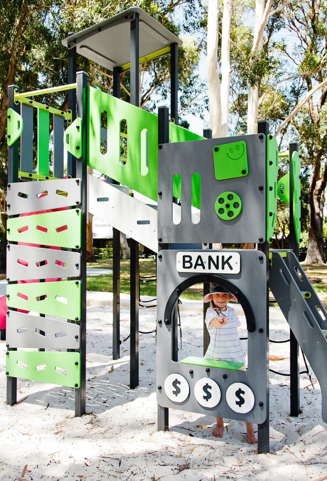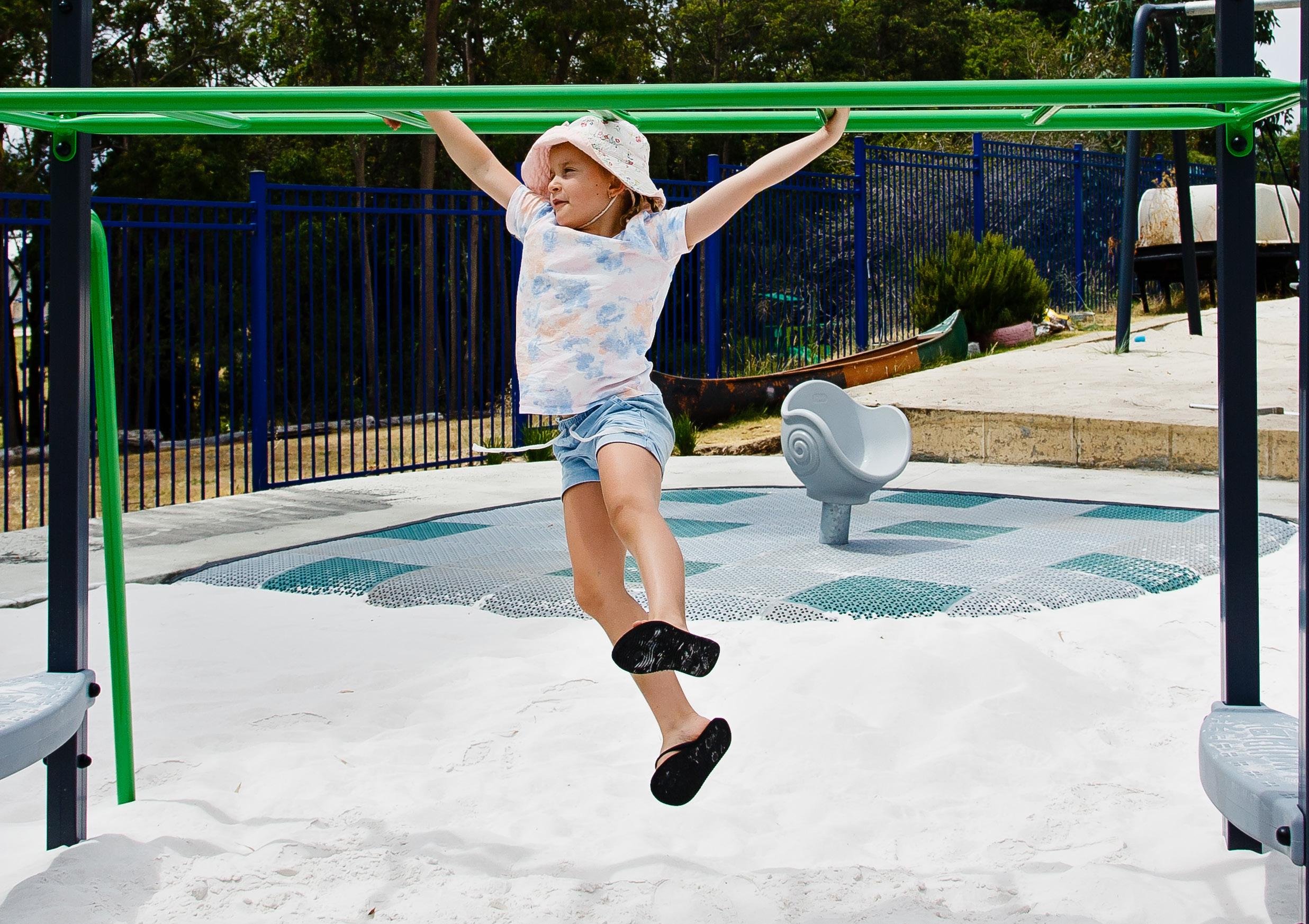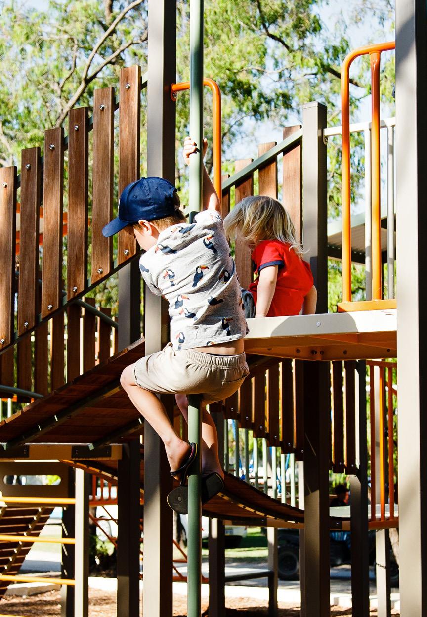 Cantwell Park is bursting with adventure and fun and set against a backdrop of the winding Murray River and surrounded by lush leafy trees. The eye-catching Willplay Spinning Orb takes centre stage, it can accommodate several kids at once and everyone can have a turn to see who can spin it the fastest. Go exploring off-road in the jeep, find the abseil rope and climb to the top of the mountain then slide down! The sand sieve station and range of beautiful Percussion Play instruments throughout the park add a wonderful sensory element to this nature focused playspace