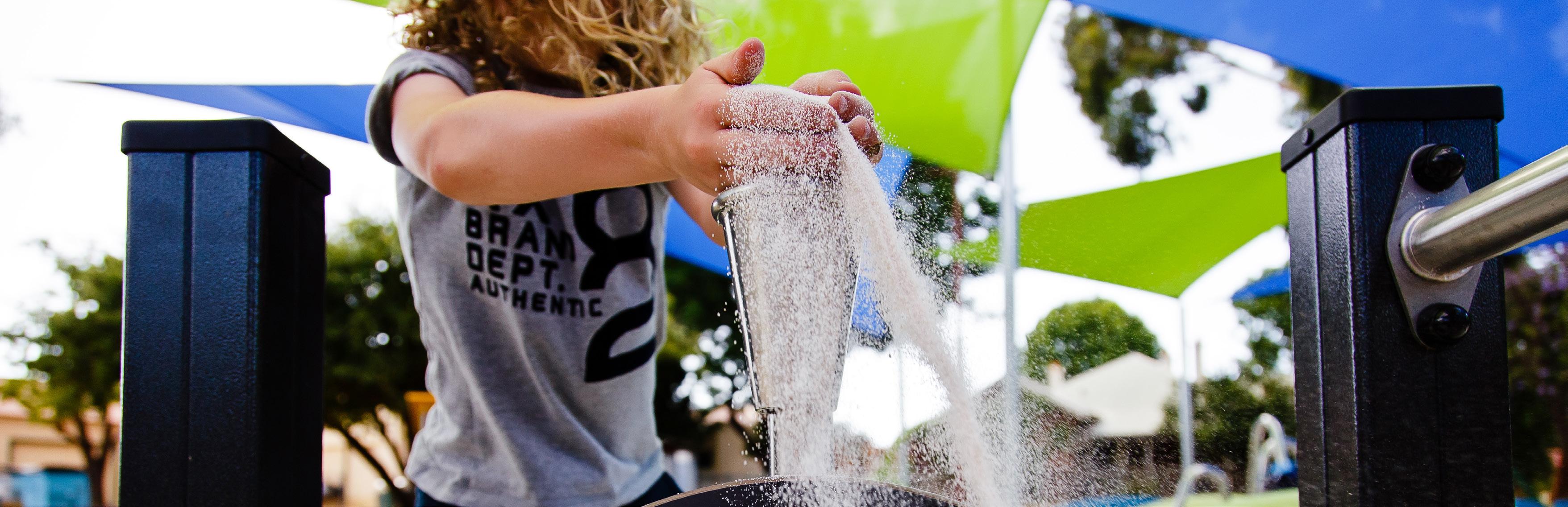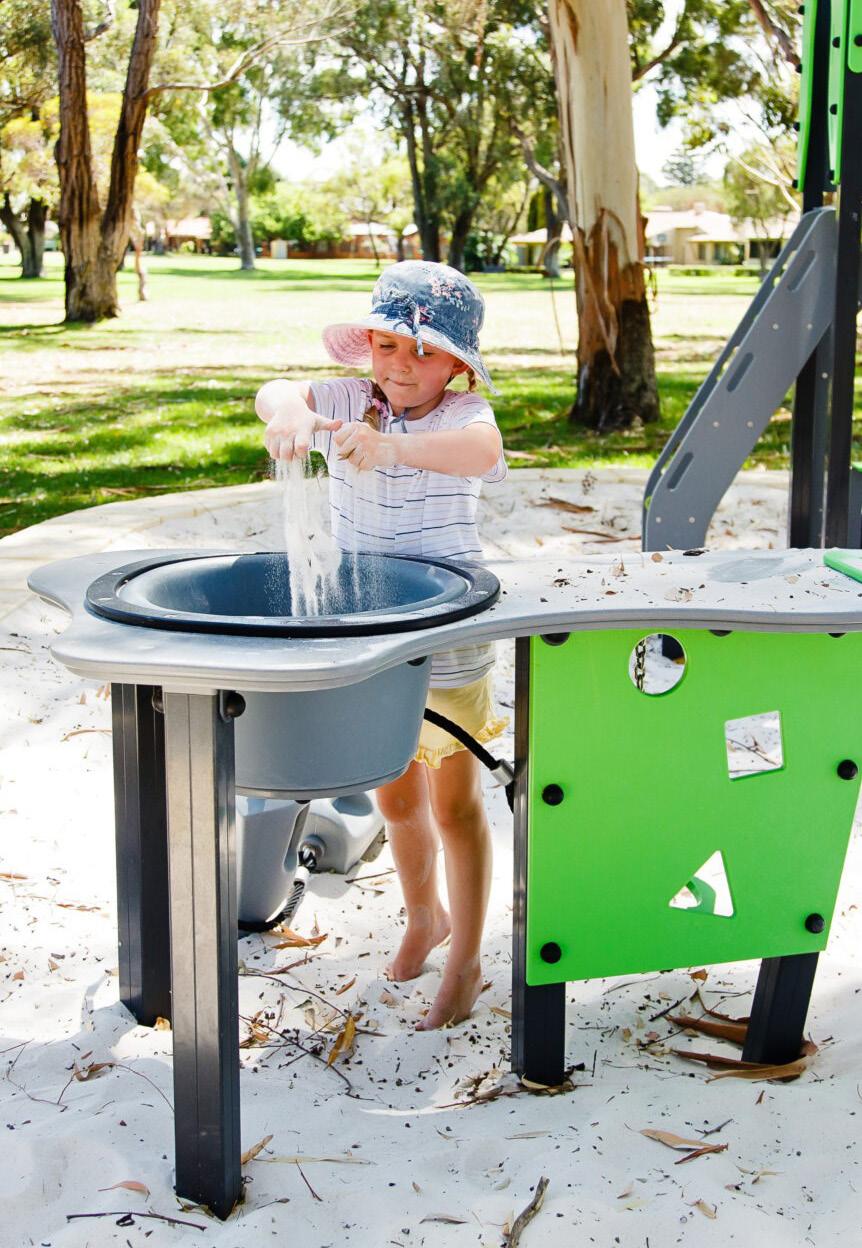 Sensory play facilitates exploration and naturally encourages children to use scientific processes while they create, investigate and explore. The stimulation that comes from touch receptors in our skin and reacts to pressure, heat/cold, texture or vibration. Tactile experiences with different mediums such as sand, water, mulch, pebbles, textured pathways and boardwalks can be strategically incorporated into playspace design. The opportunities for tactile experiences in a playspace are endless!