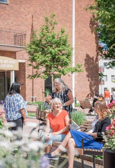 Anna fortsätter ”För oss handlar hållbart byggande inte enbart om strukturerna vi reser, utan också om de mellanrum vi skapar däremellan. Vi tror att livet mellan husen är avgörande för att främja gemenskap, välmående och social samhörighet. Genom att utforma de omgivande miljöerna och utrymmen med omsorg, siktar vi på att det ska bli en plattform för spontana möten, lek och samspel, som fångar mångas hjärtan. Här nns tillgång till bastu, lekplats och ett utomhusgym för att möta olika åldrar och tillfällen”.