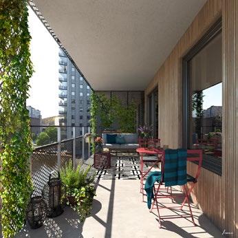 De lägenheter som har uteplats får en helt privat yta genom att terrasserna höjs upp från marknivå. Övriga lägenheter har balkonger där de som ligger mot vägen blir inglasade.