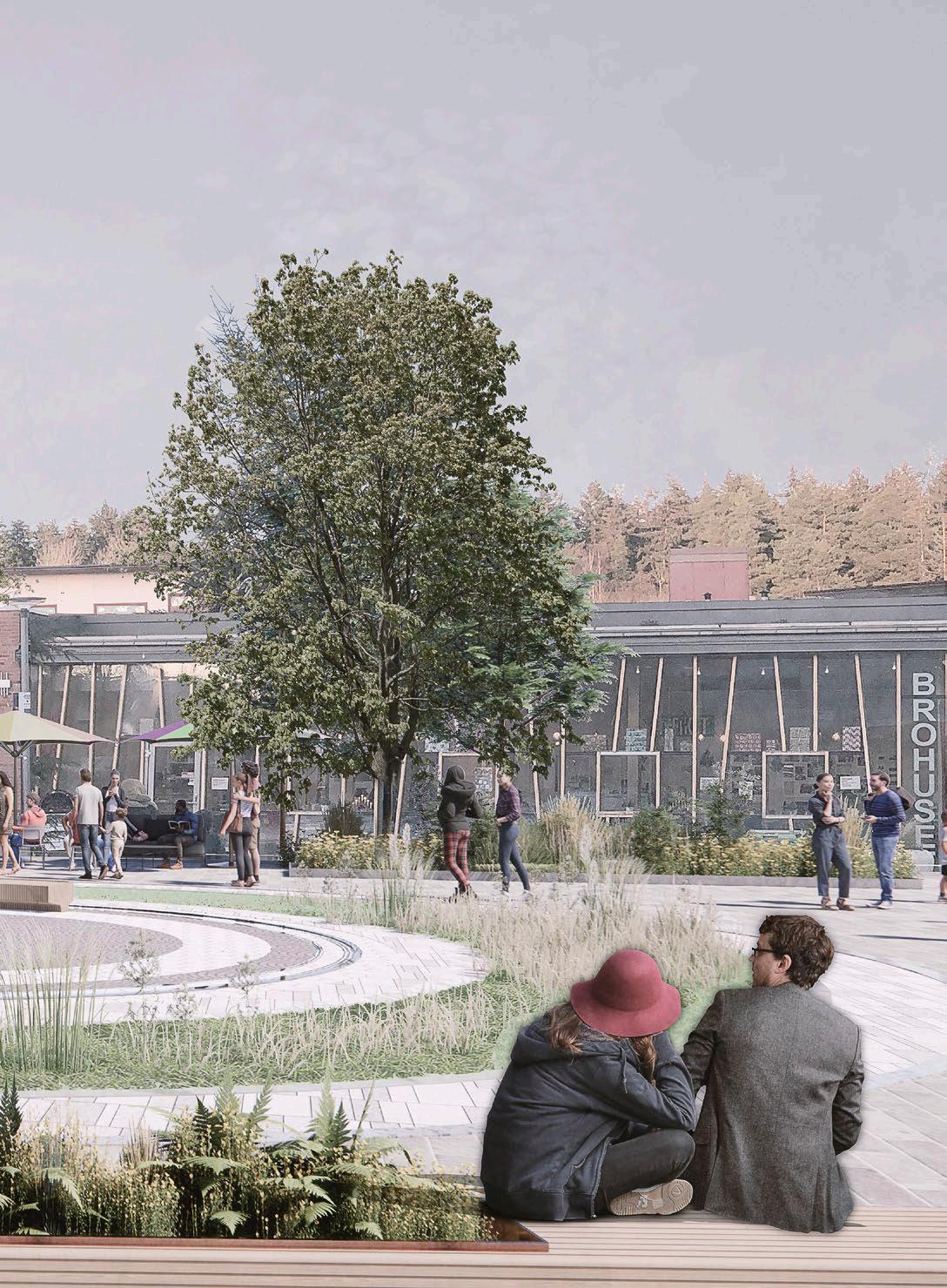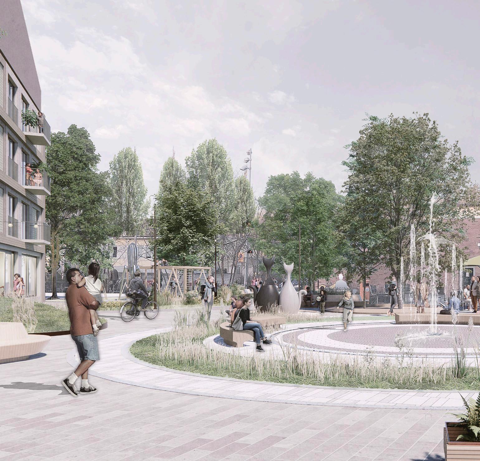 En visionsbild över hur Broplan kan komma att se ut. Framför Brohuset anläggs ett grönskande torg och mötesplats med träd, planteringar, lekplats och vattenlek för barn. Ett nytt bostadshus uppförs i anslutning med utsikt över torget.
