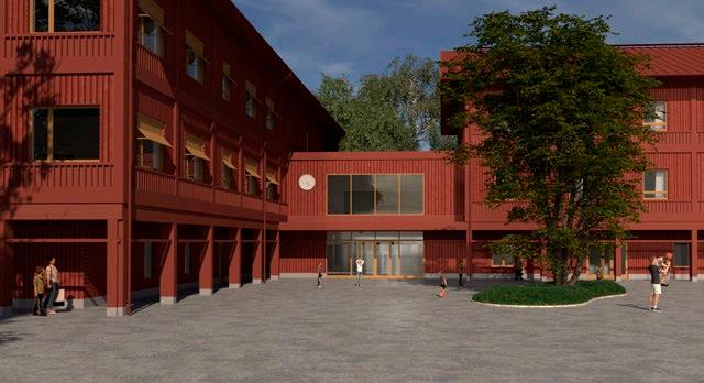 Raoul Wallenbergskolan byggs i trä med röd träpanel.