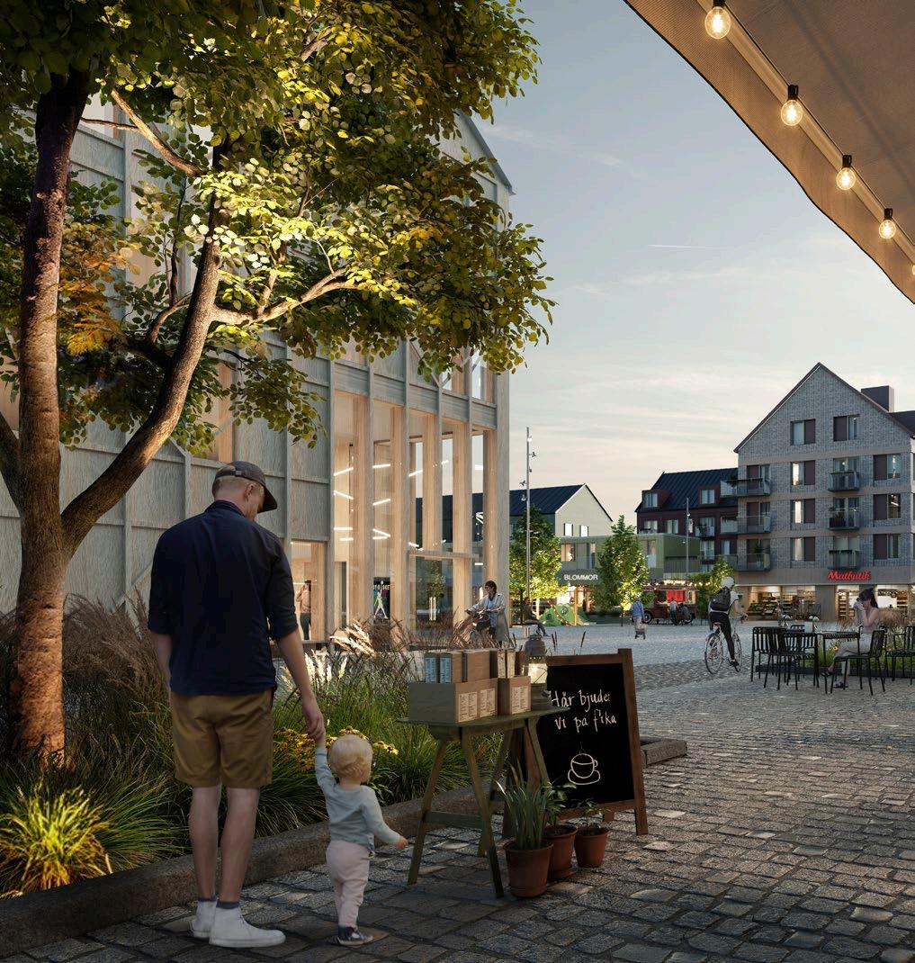 Viby torg år 2027. Barn och föräldrar på väg till den nyöppnade Raoul Wallenbergskolan, till Hemköpsbutiken eller jobbet. Runt torget finns små mysiga fik och butiker.