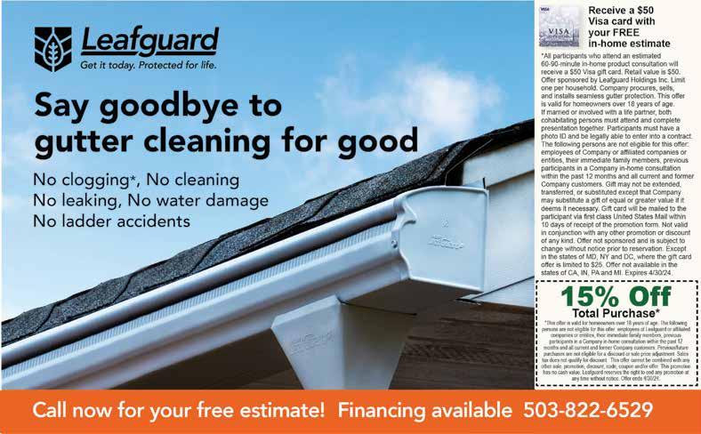 CARPET CLEANING PROFESSIONALS HALLWAYS COUNT AS ONE ROOM STAIRS COUNT AS ONE ROOM 5% FEE WOW! 1/2 OFF All Furniture WOW! 1/2 OFF Scotchgard® WOW! 1/2 OFF All Area Rugs WOW! Deep Steam Cleaning WOW! No Square Footage Limit! WOW! COUPON COUPON COUPON COUPON DEEP STEAM CLEANING DEEP STEAM CLEANING DEEP STEAM CLEANING 24 hour cancellation or reschedule notice required. With this coupon. Not valid with any other offer. Expires 6/15/24. 24 hour cancellation or reschedule notice required. With this coupon. Not valid with any other offer. Expires 6/15/24. 24 hour cancellation or reschedule notice required. With this coupon. Not valid with any other offer. Expires 6/15/24. 24 hour cancellation or reschedule notice required. With this coupon. Not valid with any other offer. Expires 6/15/24. WOW! WOW! WOW! 3-4 ROOMS SPECIAL 5-6 ROOMS SPECIAL 7-8 ROOMS SPECIAL LUXURY 9-10 ROOMS SPECIAL DEEP STEAM CLEANING FREE Pre-Spotting FREE Oxi-Brighteners FREE Mild Deodorizers FREE Pre-Treatment NO EXCEPTIONS Covers Whole House Best Price BESTPRICE CARPET CARE WOW! ONLY $20 EXTRA per room for heavily soiled rooms no exceptions $9995 $12995 $16995 $19995 50% off Expert Pet Stain & Odor Removal ONLY $50 IMPORTANT One Large Living/Dining Room & XXL Rooms Are Considered TWO Rooms - NO Exceptions Any 2nd Floor $20 Extra - NO Exceptions Any 3rd Floor $40 Extra - NO Exceptions $15 TRIP CHARGE 360.949.2286 BATHTUBS SHOWERS BATH CONVERSIONS WALK-IN TUBS With the custom bathtub selection from Miller Home Renovations, you’ll enjoy a lifetime of luxurious bathing. Save space in any size bathroom by having our expert team install a beautiful shower customized to your needs Upgrade your bathroom in no time with the no-mess, affordable bath conversion from Miller Home Renovations Walk-in tubs offer superior safety options and stylish features that let you regain your bathing independence. 1-2 DAY INSTALL BATH REMODEL FOR LESS NO INTEREST, NO PAYMENTS ENJOY OUR LIMITED TIME OFFER - MAKE NO PAYMENTS AND PAY NO INTEREST FOR UP TO 18 MONTHS ON YOUR NEW BATHROOM REMODEL! FOR QUALIFIED BUYERS • SEE US FOR COMPLETE DETAILS • CANNOT BE COMBINED WITH ANY OTHER OFFERS • EXP 8/31/24 FREE QUOTE 503-847-2518 • millerhomerenovations.net WA: MILLEHR775RL • CCB 183891 $1500 OFF YOUR NEXT PROJECT FOR QUALIFIED BUYERS • SEE US FOR COMPLETE DETAILS • CANNOT BE COMBINED WITH ANY OTHER OFFERS • EXP 6/15/24 READ MORE AT CITYHANDSHAKE.COM 33