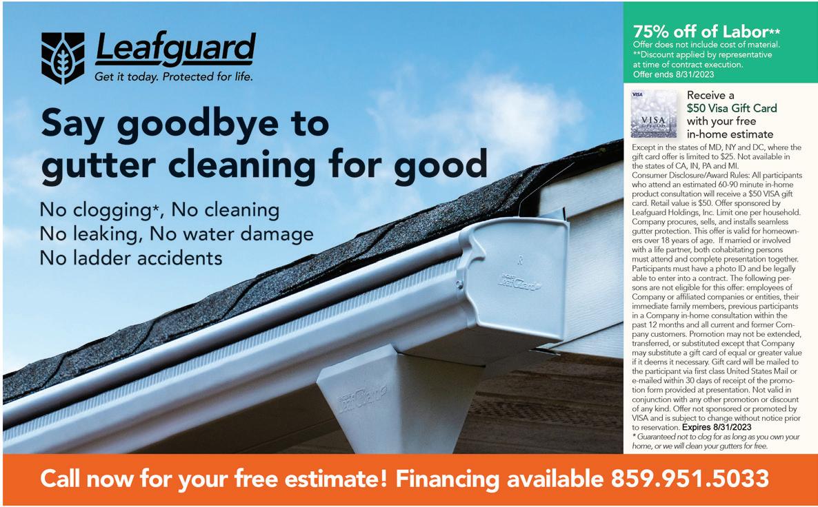 Say “NO” to Cleaning Out Gutters. Protect Your Home With LeafFilter. LET THE PROS HANDLE IT!™ 15 10 0% APR For 24 Months! ** OFF OFF % Claim Your Discount Now!* EXPIRES 9/30/2023 % Your Entire Purchase Seniors & Military + See Representative for full warranty details. *One coupon per household. No obligation estimate valid for 1 year. OR# 218294 **Wells Fargo Home Projects credit card is issued by Wells Fargo Bank, N.A., an Equal Housing Lender. Special terms for 24 mo. apply to qualifying purchases of $1,000 or more with approved credit. Minimum monthly payments will not pay off balance before end of promotional period. APR for new purchases is 28.99%. Effective: 01/01/2023 - subject to change. Call 1-800-431-5921 for complete details. Call 1-844-440-9814 FOR A FREE ESTIMATE! LeafFilter.com/solved Promo Code: 272 WE CLEAN WE SEAL WE INSTALL COMMUNITYADVANTAGEMAGAZINES.COM R 19