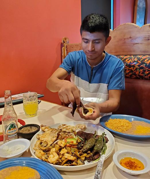 charcoal to perfection. Another favorite is the Camarones Mojo de Ajo–succulent shrimp and juicy mushrooms sauteed in butter, garlic, spices, and served with rice, beans, and tortillas. Martin says customers love the Pollo Con Crema–juicy boneless chicken breast prepared in a delicious parmacheese sauce and served with rice and beans.