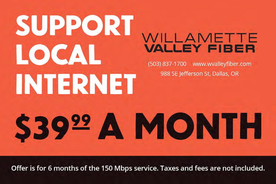 Willamette Valley Fiber operates a cutting-edge fiber-tothe-home internet and phone service with data speeds up to 1 gigabyte. They are the only fiber-to-the-home provider in the market, a responsibility they do not take lightly, and their infrastructure (including resiliency and redundancy)