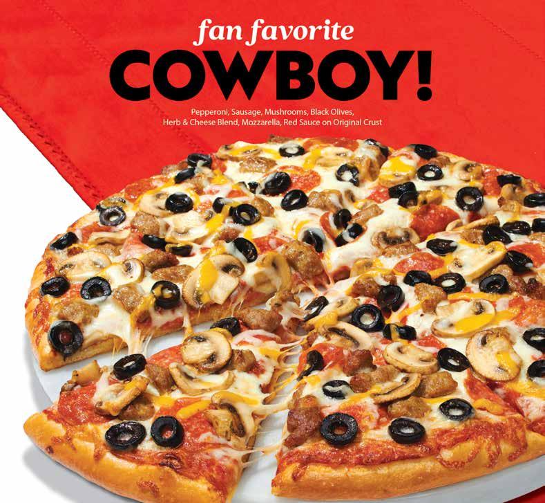 $3 OFF LARGE SIZE PIZZA Discount off regular menu price. In-Store Orders Only Limited time offer. Limit 1. Excludes XLNY®, Tuesday and Friday pizza deals. Not valid with any other offers, specials, promotions or discounts. Valid at participating locations. Cannot be sold, transferred or duplicated. $4 OFF FAMILY SIZE PIZZA Discount off regular menu price. In-Store Orders Only Limited time offer. Limit 1. Excludes XLNY®, Tuesday and Friday pizza deals.Not valid with any other offers, specials, promotions or discounts. Valid at participating locations. Cannot be sold, transferred or duplicated. $12 LARGE COWBOY PIZZA In-Store Orders Only Pepperoni, Sausage, Mushrooms, Black Olives, Herb & Cheese Blend, Mozzarella, Red Sauce on Original crust. Limited time offer. Limit 3. Not valid with any other offers, specials,promotions or discounts. Valid at participating locations.Cannot be sold,transferred or duplicated. $12 LARGE GARLIC CHICKEN In-Store Orders Only Grilled Chicken, Roma Tomatoes, Green Onions, Cheddar, Herb & Cheese Blend, Mozzarella, and Creamy Garlic on Original crust. Limited time offer. Limit 3. Not valid with any other offers, specials,promotions or discounts. Valid at participating locations.Cannot be sold,transferred or duplicated. LARGE PEPPERONI $8 Limited time offer. Limit 3. Not valid with any other offers, specials,promotions or discounts. Valid at participating locations. Cannot be sold,transferred Order at PapaMurphys.com STAYTON • 1754 N First Ave • 503-767-7272 (located between Muchas Gracias & Ace Hardware) TUESDAY DEAL ANY LARGE PIZZA $12.99
