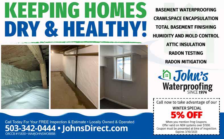 BEFORE AFTER ROOF REPAIR ROOF REPLACEMENT GUTTERS GUTTER GUARDS SKYLIGHTS ATTIC INSULATION $500 ANY FULL ROOF REPLACEMENT PROJECT. Restrictions apply. Call for details. Coupons must be presented and redeemed at time of sale. Cannot be combined with any other offer. Expires 4/15/23 OFF $200 ANY AIR SEALING & INSULATION PACKAGE Cannot be combined with any other offer. Not valid for prior work, must be presented and redeemed at time of estimate. Expires 4/15/23. OFF Josh Lowe OWNER ROOFING! 503-683-8282 KRSofOregonMag.com CCB #231578 IT’S NOT RIGHT! It’s wasting your money every month and making your home uncomfortable. If your ATTIC looks like this… THIS IS RIGHT! WHY WAIT? It pays for itself! And it’s what’s underneath that makes your whole house WARMER in winter and COOLER in summer. Call us for a free estimate and find out what it is! CCB #176741 Contact us for a FREE ESTIMATE 503-744-5004 DrEnergySaverPNW.com A NEW ROOF FOR AS LITTLE AS $175 A MONTH!* *Based on $15,000 Reroof