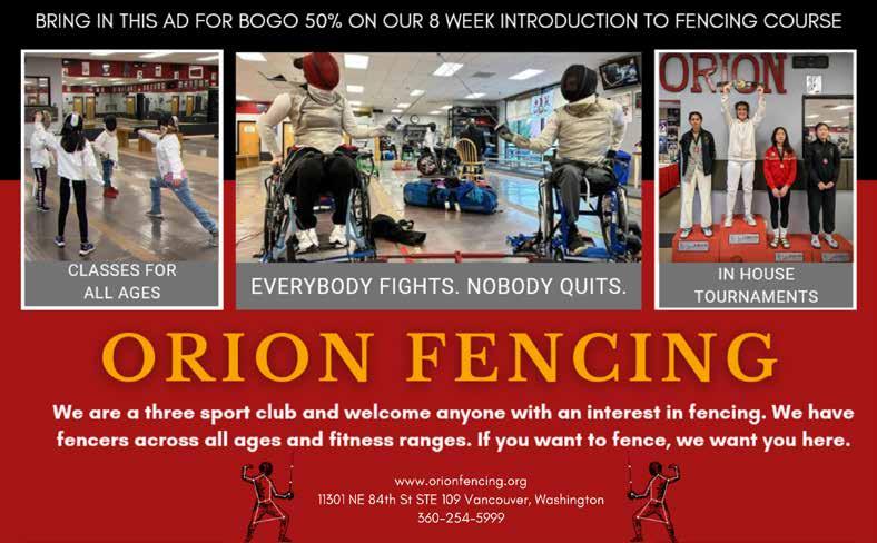 Orion Fencing Club is located at 13504 NE 84th St., Suite 109 in Vancouver. For additional information visit orionfencing.org, call (360)254-5999 or email info@orionfencing.org.