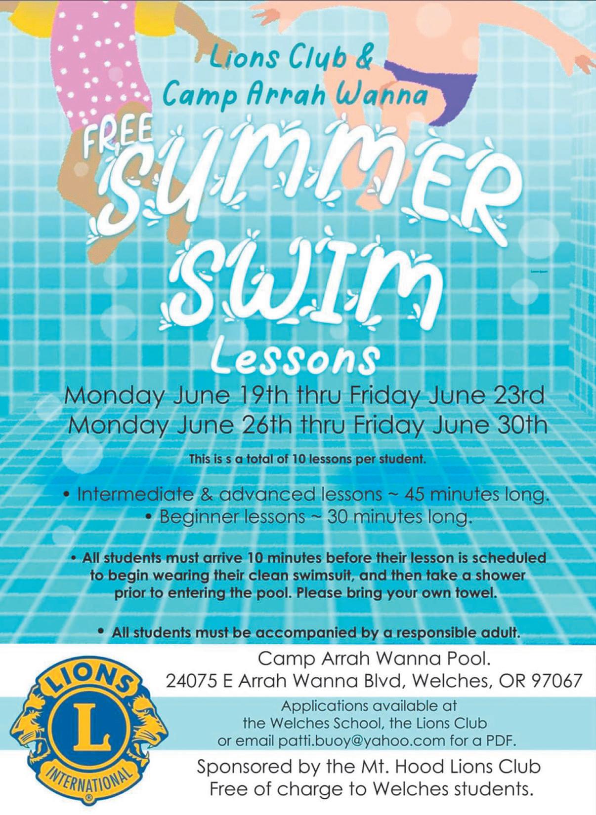 Our Free Swimming Lessons program is back again this year. Lessons will be held at the Camp Arrah Wanna pool. We are able to offer these lessons free of charge to Welches School students and local Mountain children. Registration forms are available at Welches School and at the Lions Club, and must be returned no later than June 9. Lessons will begin on Monday June 19 and last through Friday June 23, lessons will begin again on Monday June 26 and last through Friday June 30. We are planning to offer Beginner, Intermediate, and Advanced lessons. Exact times will be scheduled and families contacted.
