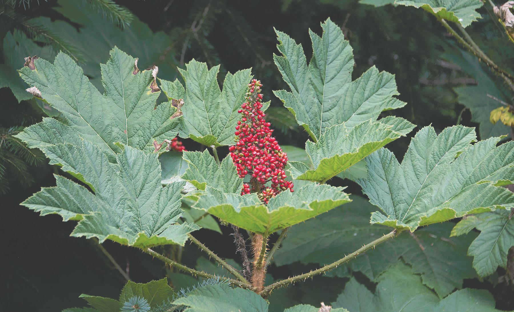 Devil’s club, a common shrub native to the Pacific Northwest named for its thorny branches and stems, (its scientific name is Oplopanax horridus) also was useful. According to the authors: This spiny shrub, related to ginseng, is still highly important as a medicine and protective agent for aboriginal peoples throughout its range. At least on the BC coast, it is one of the most important of all medicinal plants. The roots, and especially the greenish inner bark, were the major parts used for medicine. Numerous ailments, including arthritis, ulcers, and digestive tract ailments and diabetes, were treated with devils club. Possibly because of its diabolical spines, it is considered a highly powerful plant that can protect one against evil influences of many kinds. Devils club sticks are used as protective charms, and charcoal from burned devils club is used to make a protective face paint for dancers and others who are ritually vulnerable to evil influences.
